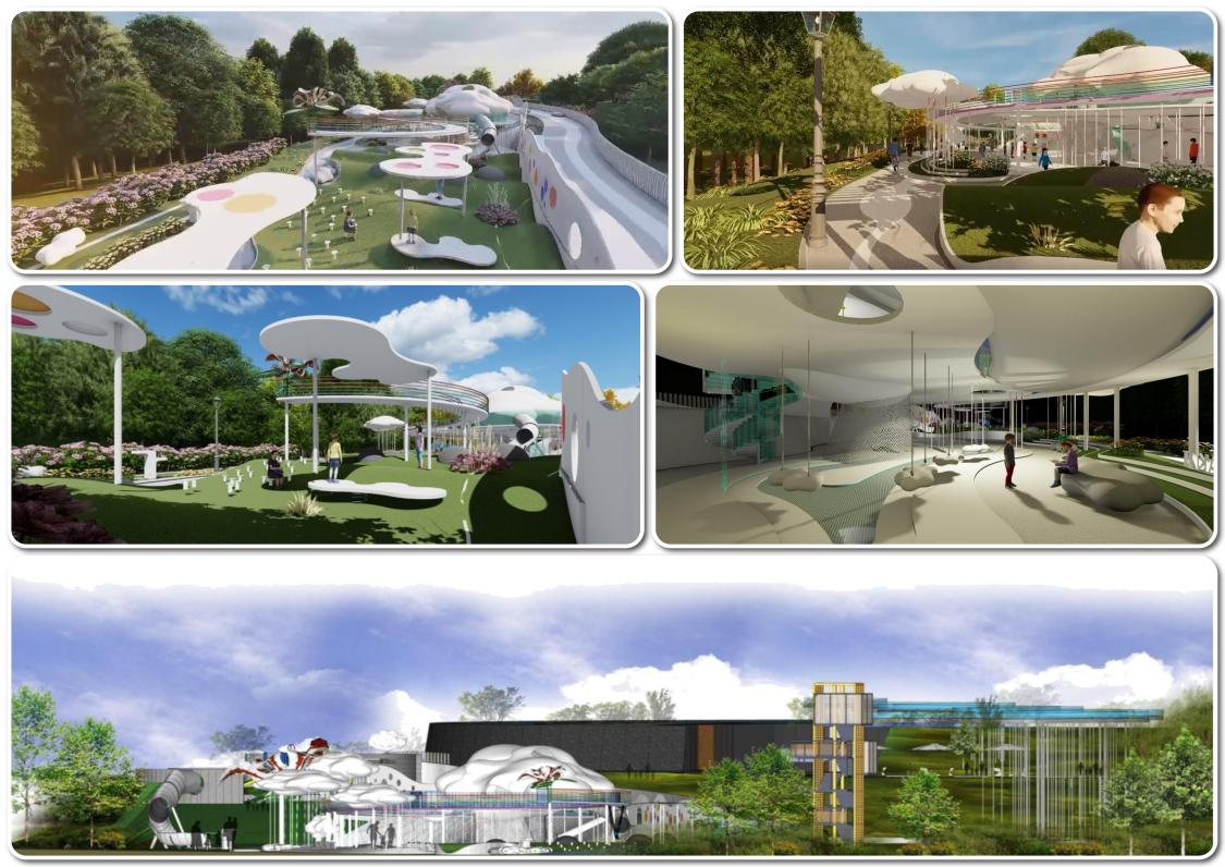 公园融入云朵、海洋、花朵、彩虹等元素,设置秋千、滑梯、空中步道、观景塔等游乐设施,打造一个多元化、普适化的综合性儿童乐园,同时满足儿童和大人的不同需求。云上乐园主题思想是期盼在云朵乐园中长大的孩子,未来会更加懂得如何与自然和谐相处。