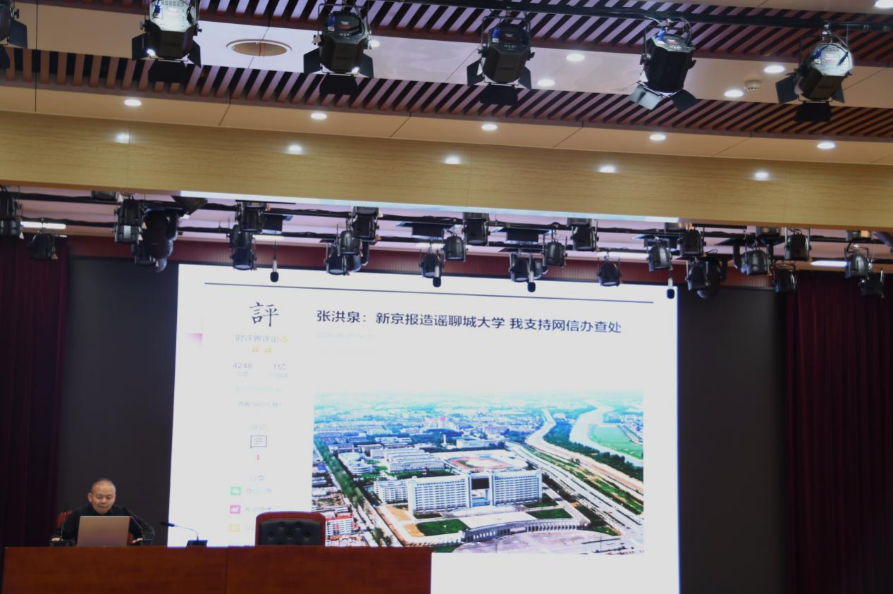 11月18日下午,学校在学团楼三楼“青年之家”召开网络舆论引导暨新闻信息媒介素养培训会,聊城市新媒体委员会会长、聊城市资深评论员张洪泉应邀作了题为《舆情应对与时评写作》的培训讲座。学校党委常委、宣传部部长苏明海出席并主持会议。