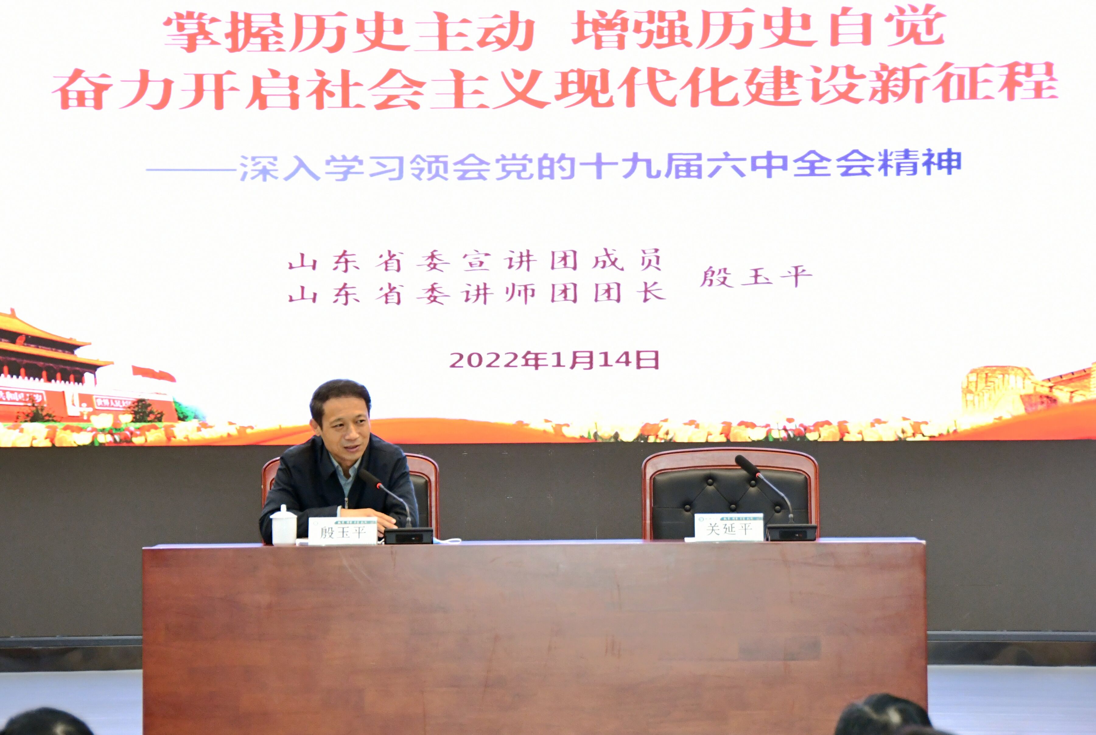 1月14日,学校党委在在青年之家举行党的十九届六中全会精神宣讲报告会暨党委理论学习中心组2022年第一次集中理论学习。党的十九届六中全会精神省委宣讲团成员、省委讲师团团长殷玉平作宣讲报告。报告会由党委书记关延平主持。