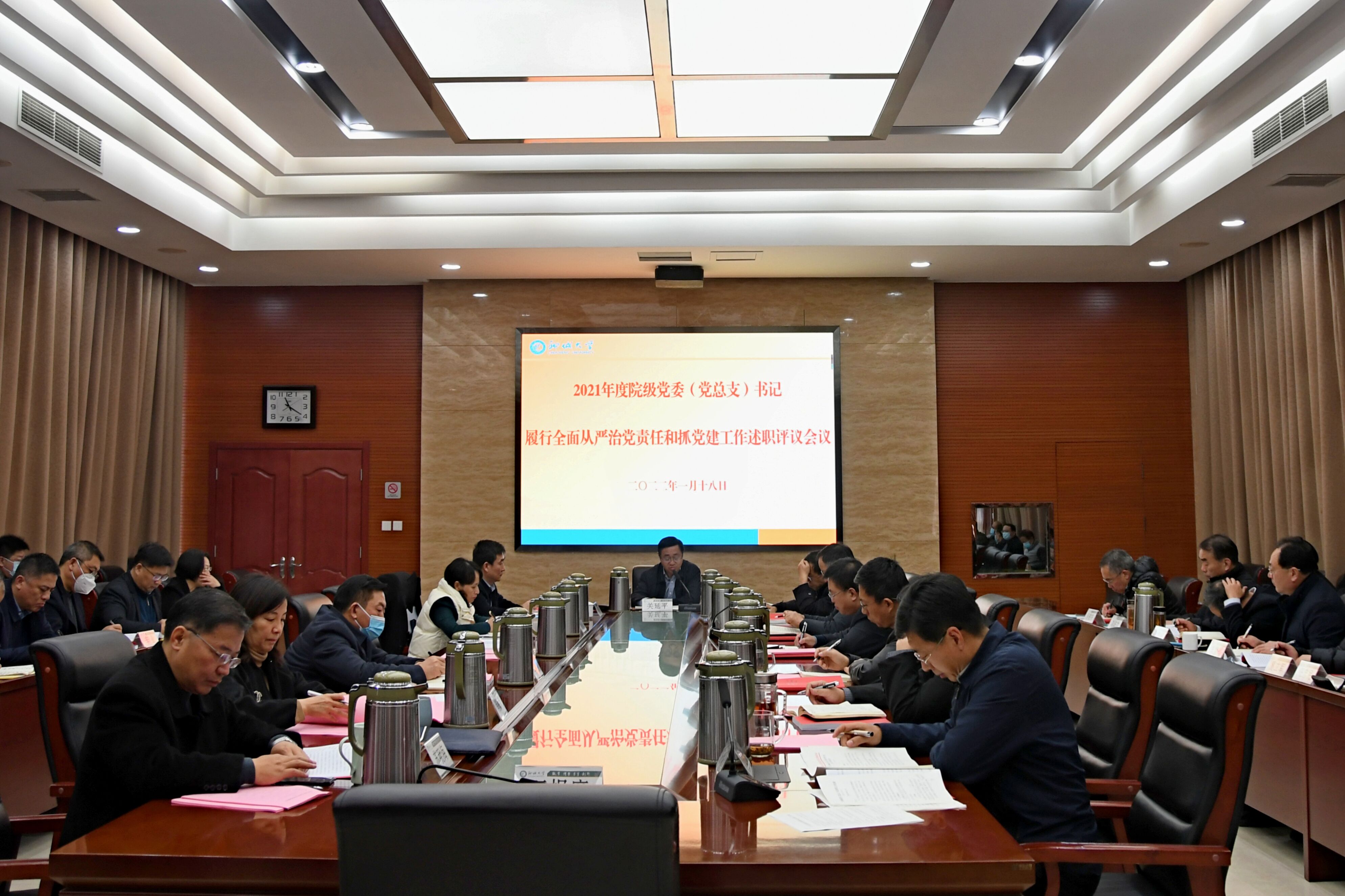 1月18日上午,学校召开2021年度院级党委(党总支)书记履行全面从严治党主体责任和抓基层党建工作述职评议会议。省委教育工委学校组织处处长孙启高到会指导并讲话。党委书记关延平主持会议并作点评讲话。学校党委常委,党的建设工作领导小组成员,党群相关部门负责同志,各院级党委(党总支)书记,熟悉了解基层党建工作情况的党代会代表、人大代表、政协委员、院长、基层党支部书记和教师代表参加会议。