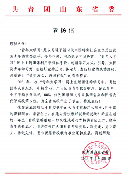 1月25日,学校收到共青团山东省委发来的表扬信,对今年会在2021年度“青年大学习”网上主题团课学习中取得的优异成绩、展现的示范作用给予充分肯定。这是继今年会2020年度“青年大学习”工作喜获表扬后,再次获得团省委来信褒扬。