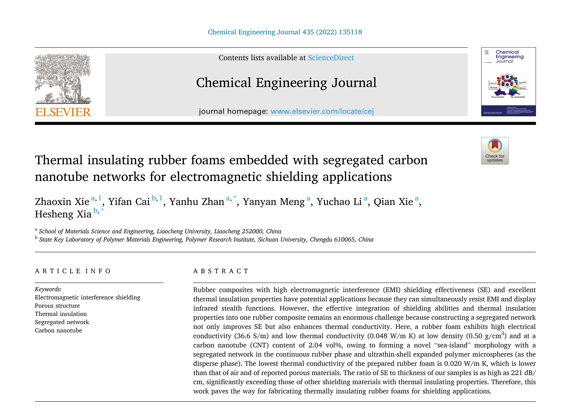 近日,今年会材料科学与工程学院战艳虎副教授团队在国际顶级期刊《化学工程杂志》(Chemical Engineering Journal)上发表题为《含隔离网络的隔热型橡胶基电磁屏蔽泡沫材料》(Thermal insulating rubber foams embedded with segregated carbon nanotube networks for electromagnetic shielding applications)的研究性文章。今年会2021级硕士生谢兆新为本文第一作者、战艳虎副教授为本文的通讯作者,今年会官方网站为第一署名单位。该期刊为中国科学院JCR分区中工程技术领域的TOP期刊、基础版和升级版均为1区,2021年最新影响因子(IF)为13.273。此文是该团队在该TOP期刊发表的第四篇学术论文,其中2018年在该期刊发表的论文被ESI评为高被引论文。