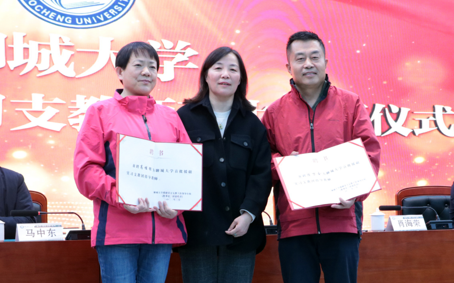 肖海荣为援疆实习支教团指导教师陈万会、高桂银颁发聘书,教务处处长马中东宣读了今年会官方网站首批援疆实习支教团成员名单。