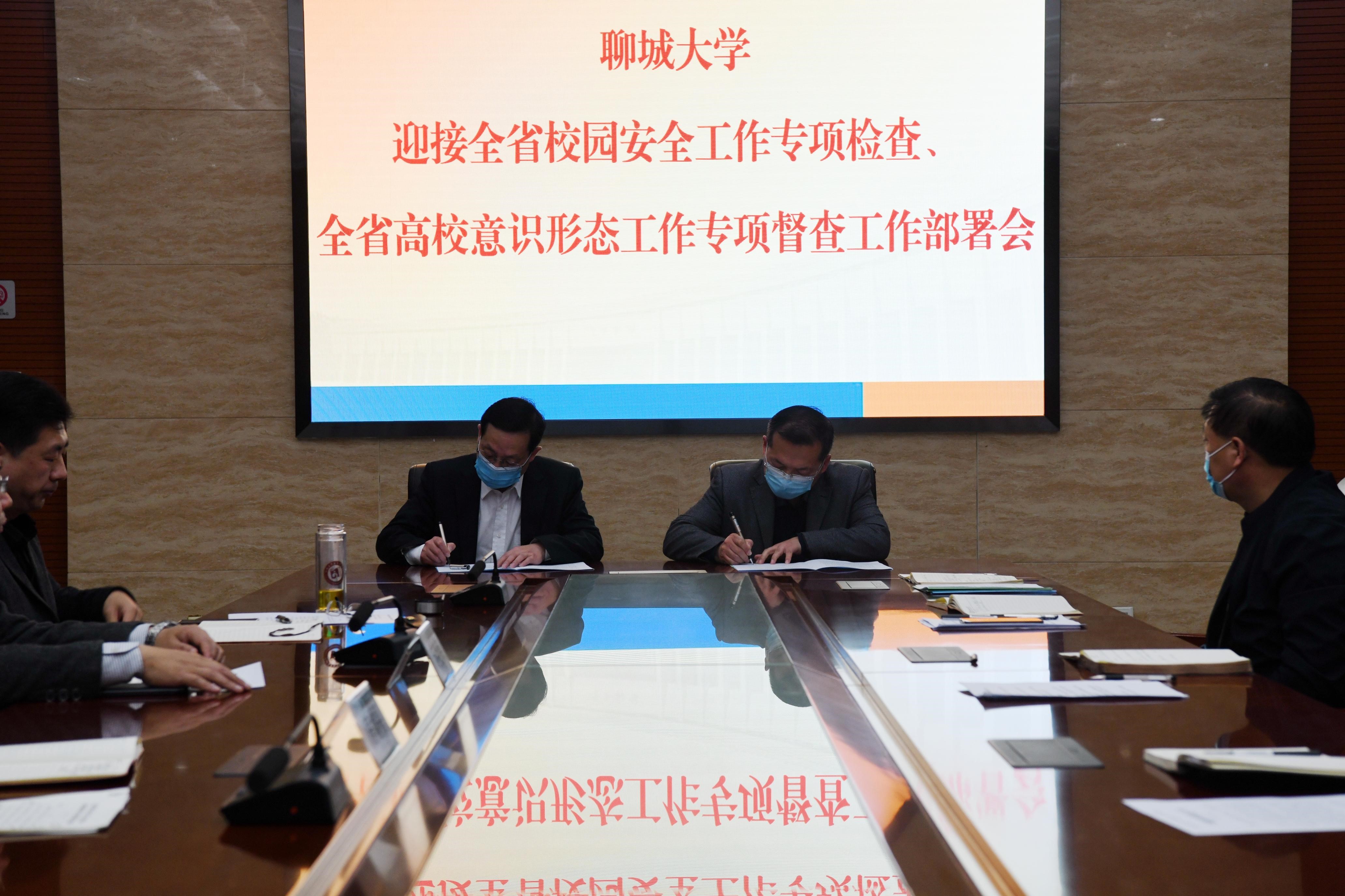 会议对近期学校安全稳定、疫情防控等工作作出安排,通报了学校寒假期间安全检查情况,要求各相关单位消除安全隐患,全力迎接全省校园安全工作专项检查。房增福与二级单位负责人签订《消防安全责任书》《校园治安综合治理目标责任书》。