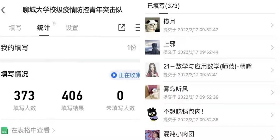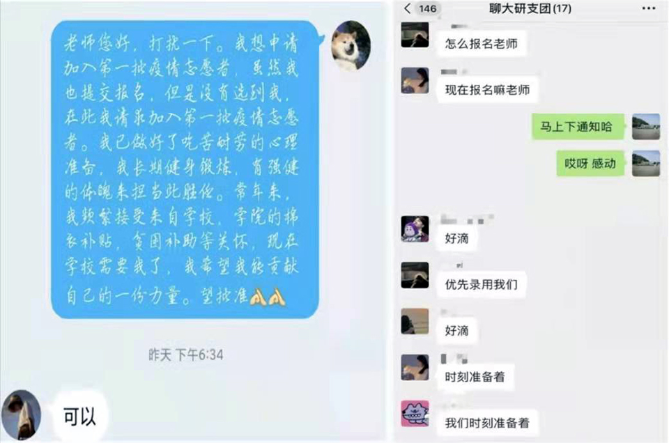 在学校疫情防控工作领导小组指导下,学校团委第一时间发布组建青年志愿者突击队的招募通知,组织策划志愿者防护培训,发布《致全校各级团学组织和团员青年的倡议书》,动员引导青年学子积极响应号召,强化示范引领,彰显青年担当。在第一批招募300名志愿者的通知发出后,10分钟内373名志愿者完成报名。招募系统内分秒间跳动的字符、增加的人数,是“聊大速度”的展现,更是聊大青年责任担当的彰显。