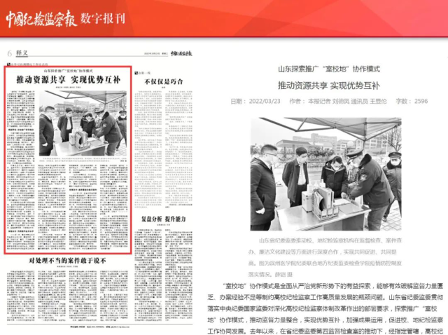 【全文链接】中国纪检监察报《山东探索推广“室校地”协作模式 推动资源共享 实现优势互补》