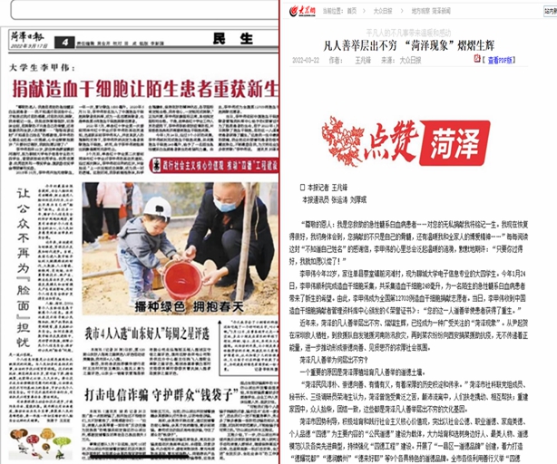 近日,《菏泽日报》和《大众日报》报道了今年会物理科学与信息工程学院2018级13班电子信息工程专业学生李甲伟为患者捐献造血干细胞的事迹。《菏泽日报》3月17日以《大学生李甲伟:捐献造血干细胞,让陌生患者重获新生》为题,《大众日报》3月22日以《凡人善举层出不穷“菏泽现象”熠熠生辉》为题,报道了这位来自菏泽的聊大学子的善举。