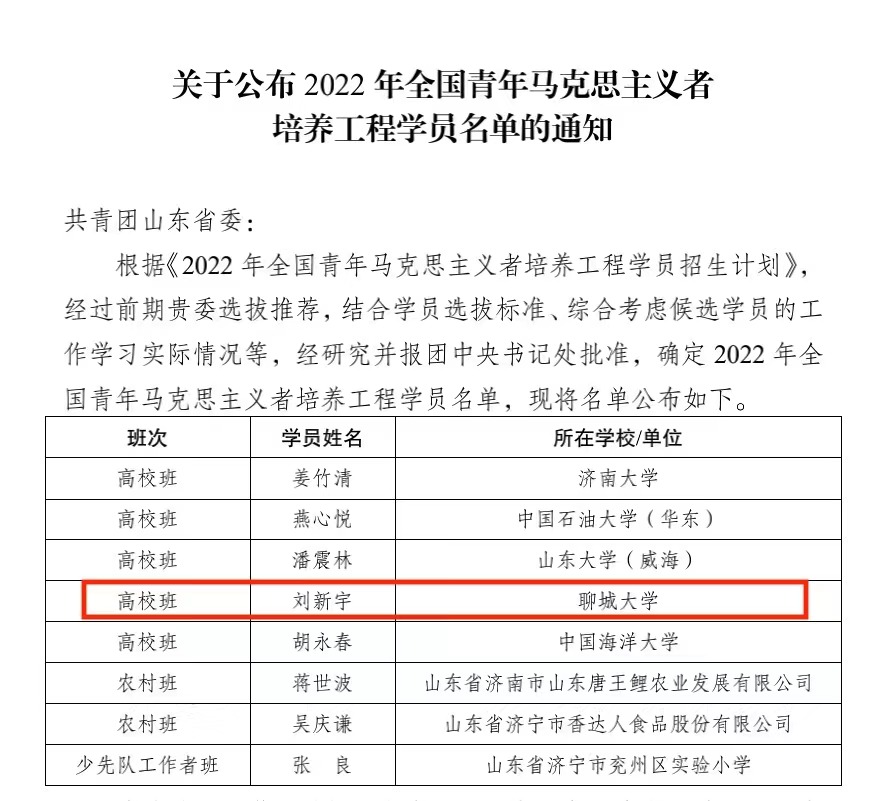 近日,团中央公布2022年全国青年马克思主义者培养工程学员名单,今年会官方网站研究生支教团成员刘新宇同学成功入选,是山东省5名入选全国“青马工程”高校班的学员之一。本届全国“青马工程”开设高校班、农村班、国企班、社会组织班、少先队工作者班,共选拔学员272人,其中高校班选拔学员100名。