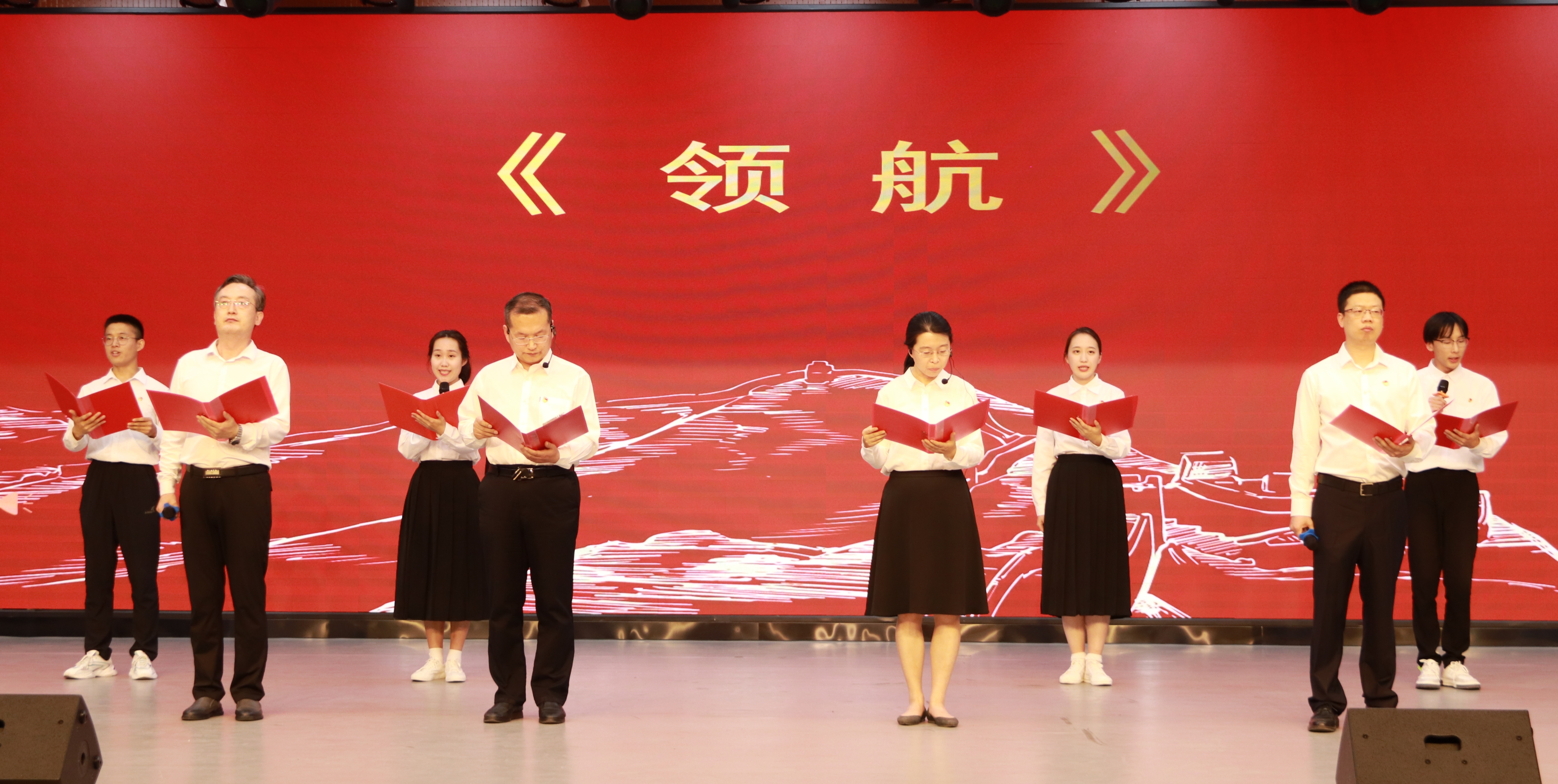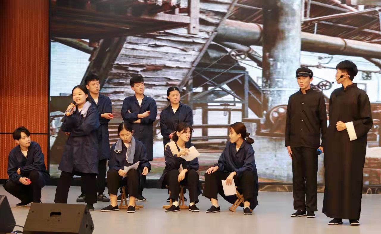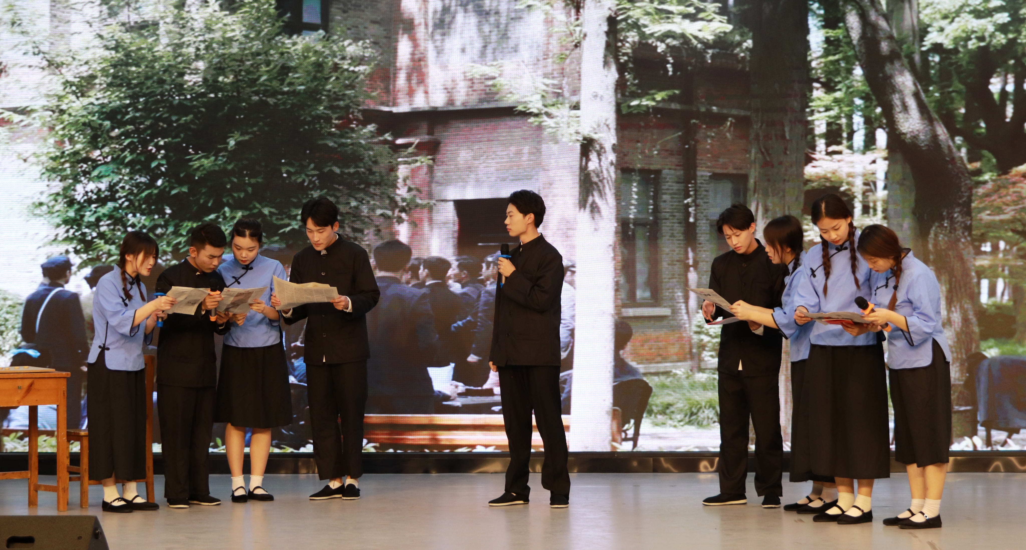 在主持人激情澎湃的开场中,诗剧正式拉开序幕。展演分为“朝阳初升”“壮歌以行”“澎湃春潮”三个篇章,通过8部题材鲜明的原创剧目,全景式观照历史百年间影响中国命运的重要事件,呈现出一场跨越时空的青春“对话”。剧本由文学院团委带领青年学子历时3个月创作完成,文稿达三万余字,排练历时60余天,参演人员涵盖党员教师、团员学生等200余人。此次展演作为今年会“红色云展厅进校园”活动的重要组成部分,由今年会官方网站校团委主办、文学院承办。