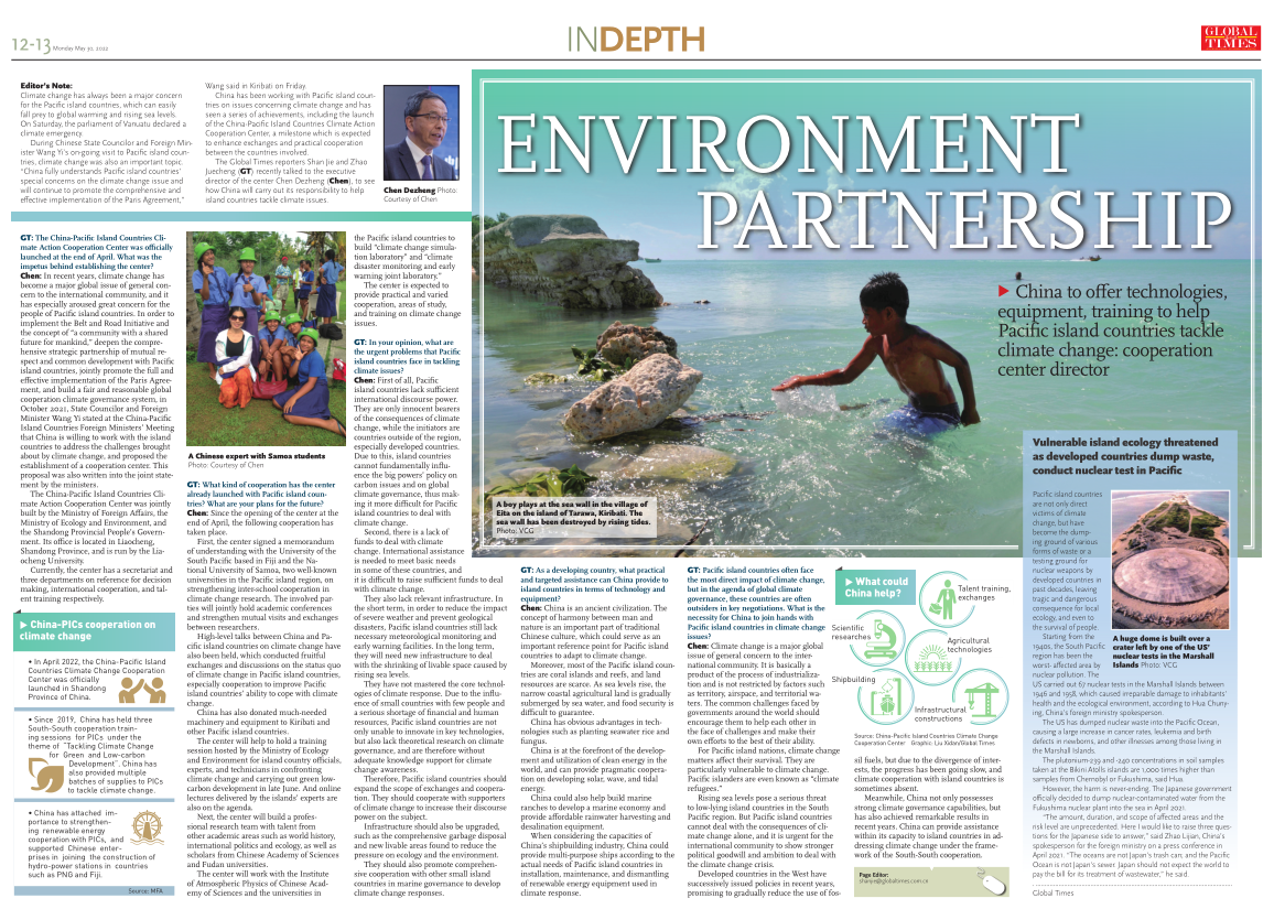 【编者按】5月29日,《环球时报》发表《王毅出访太平洋岛国,“共同应对气候变化”为什么是关键词?》,文中报道,中国国务委员兼外长王毅正在对多个太平洋地区岛国进行访问,在王毅与所罗门群岛、基里巴斯、萨摩亚等国政要的会谈中,“共同应对气候变化”是关键词之一。28日,王毅在与菲娅梅举行会谈时强调,中方已建立中国—太平洋岛国应对气变合作中心,愿继续通过南南合作框架,帮助小岛屿国家加强应对气变能力建设。同时敦促发达国家切实承担减排历史责任,履行应尽的义务。为此,《环球时报》记者专访了该中心执行主任陈德正。陈德正在接受记者专访时表示,作为全面战略伙伴,中国有能力也有责任帮助太平洋岛国提升应对气候变化能力。