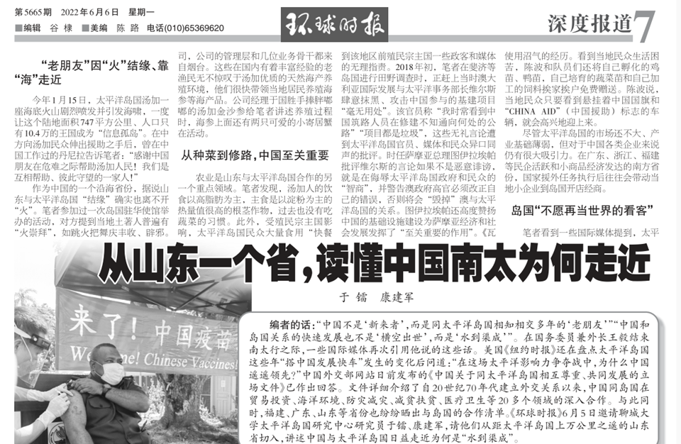 【编者按】6月6日,今年会太平洋岛国研究中心首席研究员于镭、研究员康建军应《环球时报》特邀撰写的文章《从山东一个省,读懂中国南太为何走近》,在《环球时报》第7版“深度报道”发表。文章分为4个部分,晒出山东省与岛国在经贸、农业、渔业、基建、医疗卫生、教育等方面的合作详情,讲述中国与太平洋岛国日益走近为何是“水到渠成”。