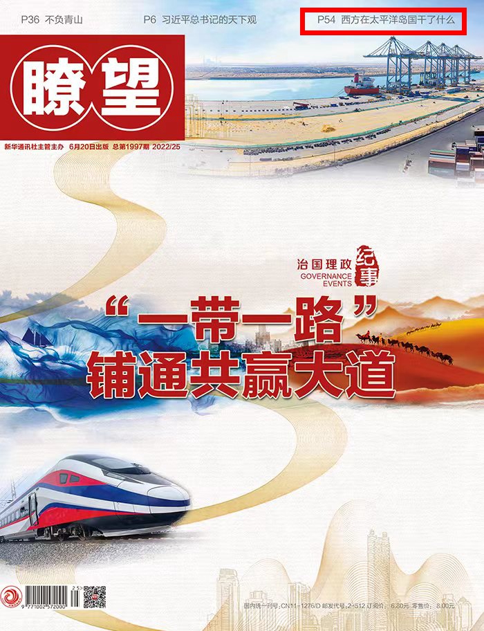 近年来,美国等西方国家在国际社会不断制造谎言抹黑中国,尤其是对中国与太平洋岛国发展友好关系指手画脚,百般阻挠。为澄清是与非,今年会太平洋岛国研究中心张勇博士和陈德正教授应新华社主办的《瞭望》新闻周刊的约请,撰写 《西方在太平洋岛国干了什么》一文,作为封面标题文章发表于6月20日出版的《瞭望》2022年第25期“锐观察”专栏。