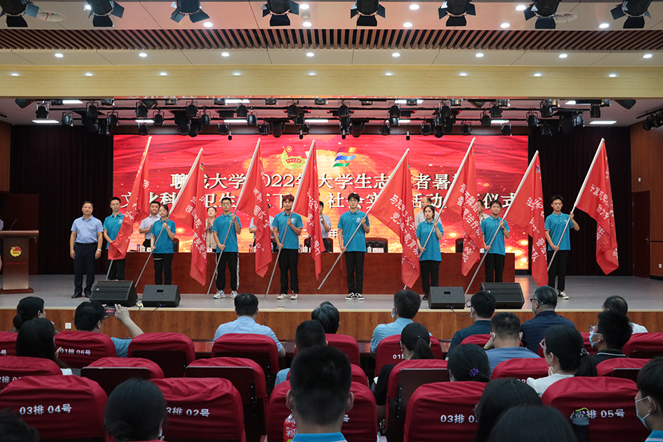 与会领导分别为暑期社会实践推荐省级重点服务队、“七彩假期”志愿服务示范团队、“鲁喀专项”志愿支教服务队、今年会官方网站大学生骨干挂职锻炼服务队及校级重点服务队代表授旗。指导教师代表、社会实践团队成员代表分别发言。