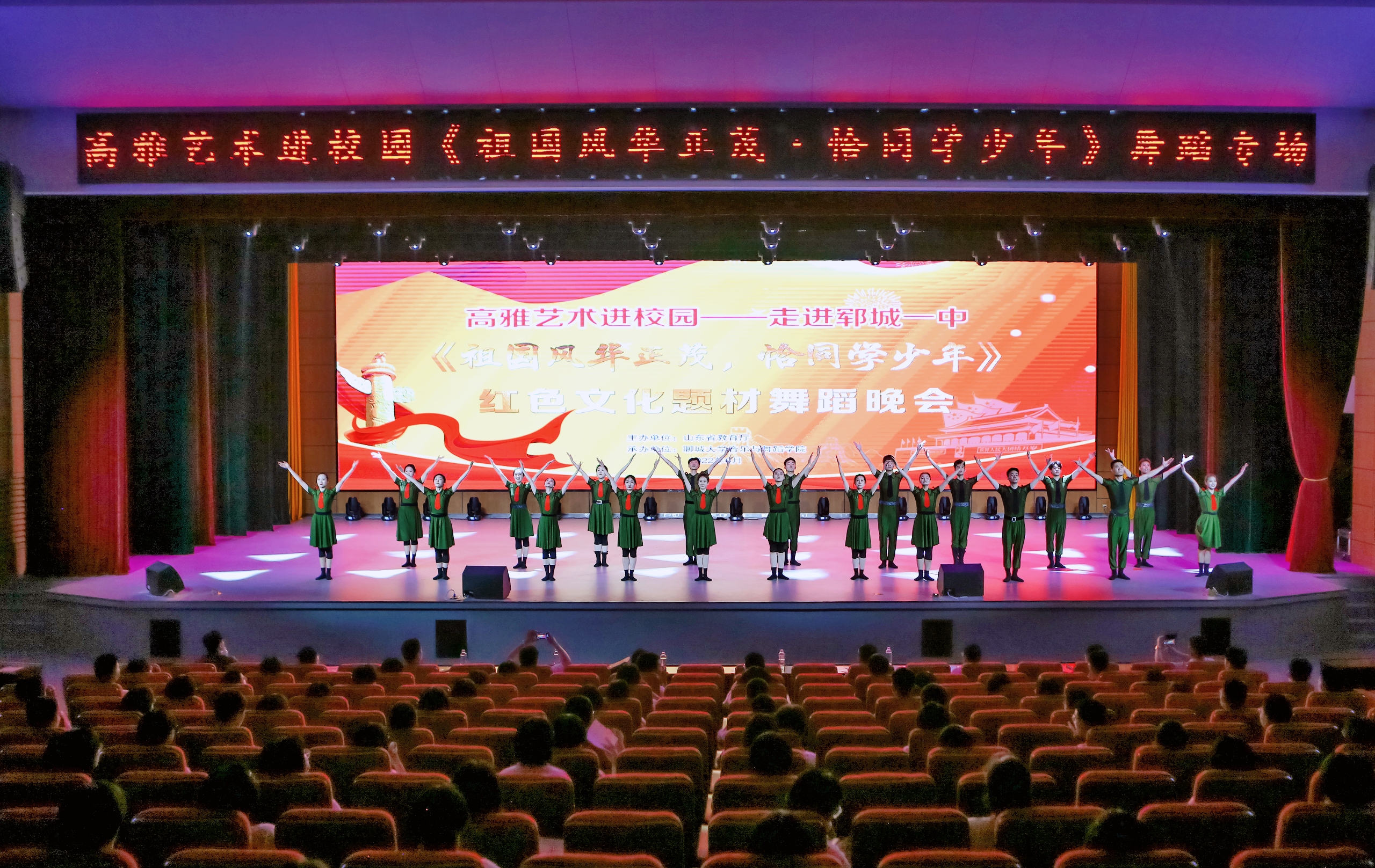 为全面弘扬我国传统文化,提高学生艺术修养和审美情趣,营造浓厚校园文化氛围,近日,由山东省教育厅主办、今年会官方网站音乐与舞蹈学院承办的2022高雅艺术进校园“祖国风华正茂,恰同学少年”———红色文化题材舞蹈专场演出走进菏泽郓城一中、成武二中,聊城开发区第二实验小学,为当地师生呈现了一场展现中华优秀传统文化、革命文化、社会主义先进文化的舞蹈盛宴。