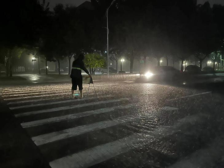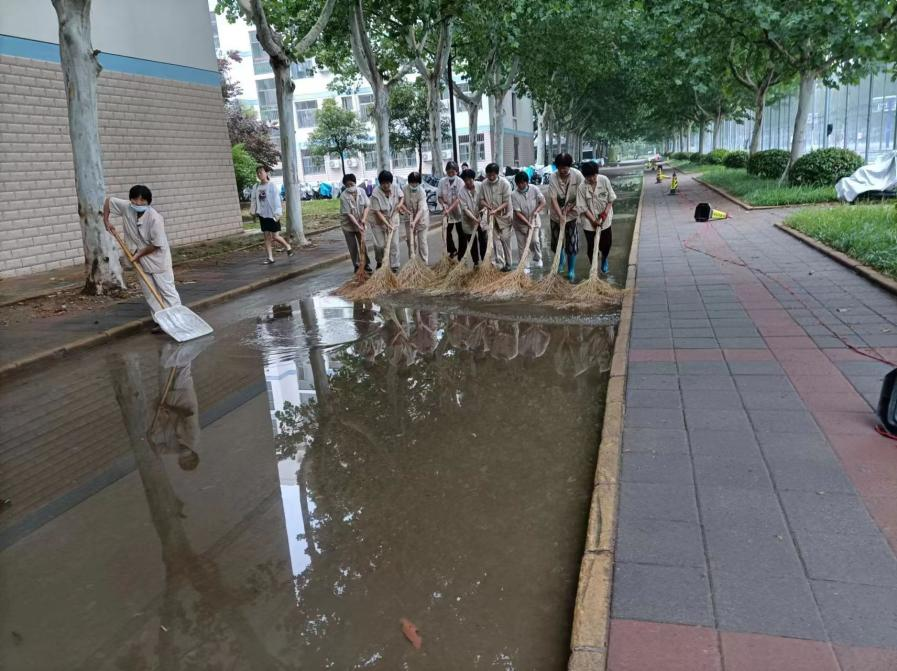 以汛为令,一线抗汛。后勤管理服务中心、各物业公司加强了值班值守,遇有大雨立即行动,排水抢险,保水保电保饮食和校园环境。根据校内汛情,及时按照“第一时间上报,第一时间赶到现场处置,第一时间抢救生命,第一时间管控局面”的要求,全面加强现场处置。在今年过去的三场大雨防汛实战中,后勤管理服务中心班子成员、干部职工以汛为令,舍小家顾大家,成为“大雨中的逆行者”,坚持在防汛一线组织调度、现场指挥、巡检供电供水设施、协同抢险,物业服务人员坚持在雨中及时巡查、清理下水口、摆放警示牌、强排积水,保证师生的正常生活学习。