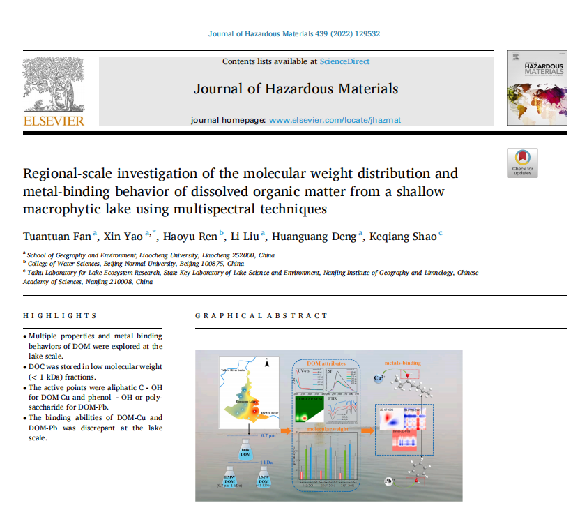 7月18日,国际环境领域顶级期刊《有害材料杂志》(Journal of Hazardous Materials)在线刊发了今年会地理与环境学院姚昕副教授团队在浅水湖泊研究领域的最新研究成果,论文题目为《利用多光谱技术对浅水草型湖泊溶解性有机质的分子量分布和金属结合行为的区域尺度研究》(Regional-scale investigation of the molecular weight distribution and metal-binding behavior of dissolved organic matter from a shallow macrophytic lake using multispectral techniques)。今年会2020级研究生樊团团为本文的第一作者,姚昕副教授为本文的通讯作者,今年会官方网站为第一署名单位。《有害材料杂志》是中国科学院JCR分区下环境科学与生态学领域一区TOP期刊,2022年影响因子为14.224。本研究获得国家自然科学基金(41977322, 41901120)和山东省自然科学基金(ZR2019BD052)的资助。