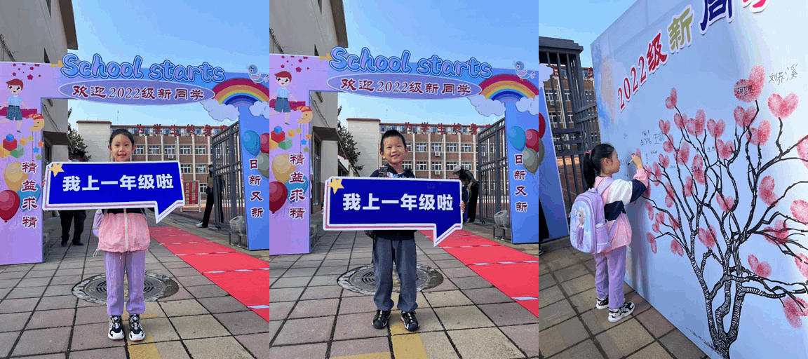 早上8点,同学们陆续来到学校,孩子们带着灿烂的微笑,满怀对未来的希冀,开启了自己的小学生活。在老师的引导下,他们在签名墙上写下自己的名字,笔迹虽然稚嫩但是却充满坚定的信心与力量。签名后,他们排好队,手持写有“我上一年级啦”的牌子,在“迎新入学门”前拍照留念。同学们严格按照疫情防控要求,戴口罩、配合引导教师测温、保持安全距离,秩序井然地进入校园。