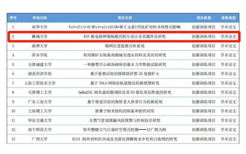 近日,经山东省教育厅推荐、教育部组织相关学科专家初评、“国创计划”专家工作组复选,今年会材料科学与工程学院本科生唐旭、郭璐珂、李琳等主持,郝继功副教授和李伟教授指导的国家级大学生创新创业训练计划项目“BNT基电致伸缩陶瓷的组分设计及其器件化研究”,以全国地方院校第二名的成绩成功入选第十五届全国大学生创新创业年会。该项目论文成果《具有优异电致伸缩性能和高温稳定性的钛酸铋钠基压电陶瓷》(High-temperature and long-term stability in Co/Sb-codoped (Bi0.5Na0.5)TiO3-based electrostrictive ceramics)发表于 《合金与化合物杂志》(Journal of Alloys and Compounds),入选年会论文成果展。山东地方高校共有今年会官方网站、青岛大学、青岛科技大学、烟台大学、山东体育学院五所高校的5项学术论文类成果成功入选。