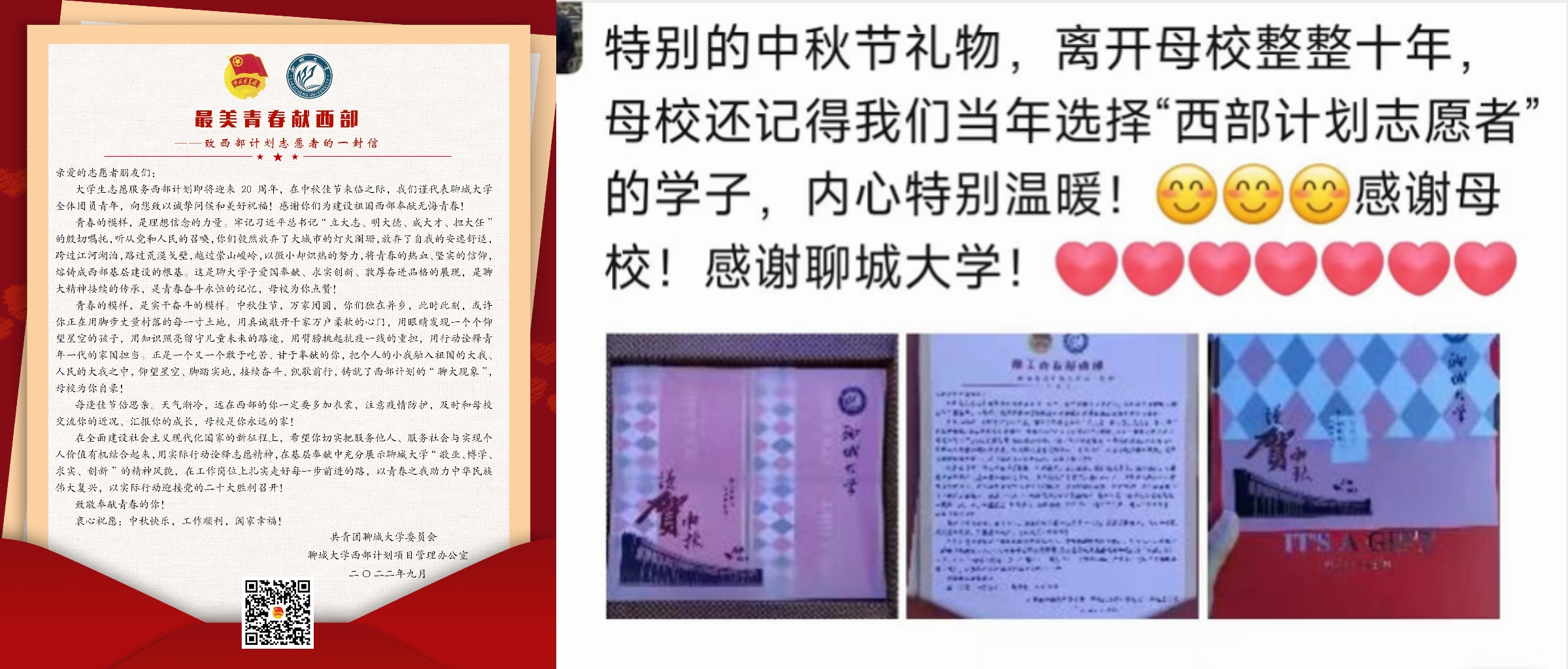 中秋期间,在校团委、校西部计划项目办的精心组织指导下,校学生会组织、青年志愿者协会、新时代“繁森精神”践行者协会积极联系在岗及扎根西部的志愿者校友们,为千里之外、在西部倾心奉献的他们精心准备,送去了温暖的中秋祝福。志愿者们纷纷表示,每逢佳节倍思亲,能够在中秋节日之际收到来自母校的温暖,心里十分感动;大家定将不负学校所托,牢记“敬业、博学、求实、创新”的聊大校训,在服务西部的道路上脚踏实地、砥砺前行。