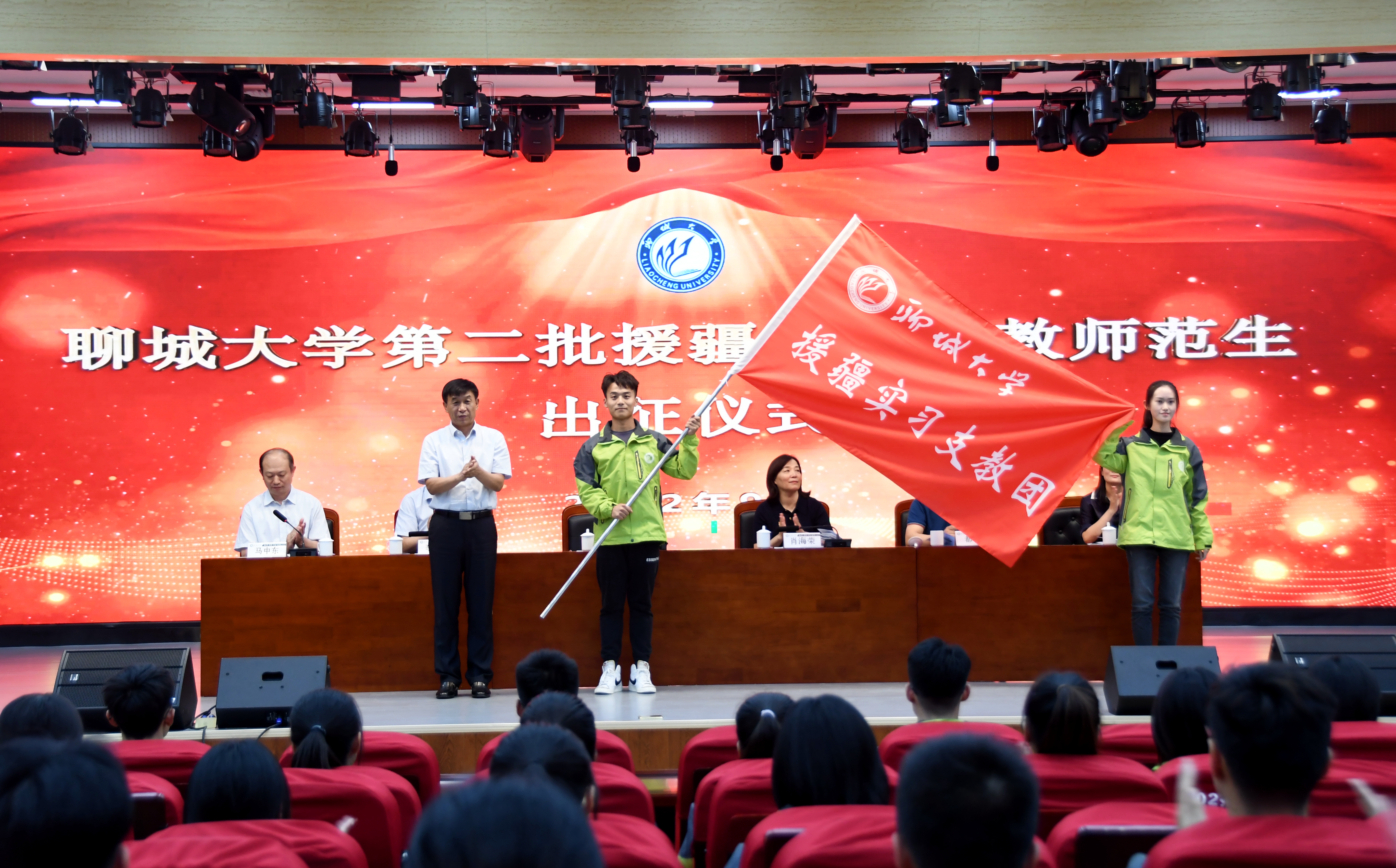 赵明吉为援疆实习支教团授旗,肖海荣为第二批援疆实习支教团指导教师颁发聘书。
