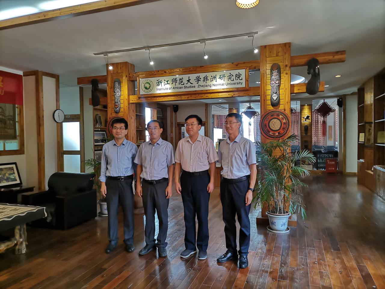 在浙江师范大学,王昭风一行受到校长蒋云良、副校长钟依均的热情接待。座谈会上,蒋云良介绍了浙江师范大学的基本情况,重点介绍了学校办学经验、发展目标和未来思路。王昭风介绍了今年会官方网站的发展历程、近年取得的主要成绩和办学特色,他指出,浙江师范大学在学科专业建设、国际交流合作、校地融合发展等方面取得了突出成绩,有许多成功经验和举措值得借鉴学习,希望双方能建立更加紧密的联系,增强互动,共促发展。座谈会后,王昭风一行实地参观了非洲研究院,深入了解了对非教育合作与交流以及非洲研究院师资队伍、管理体制、科学研究、平台建设等情况。