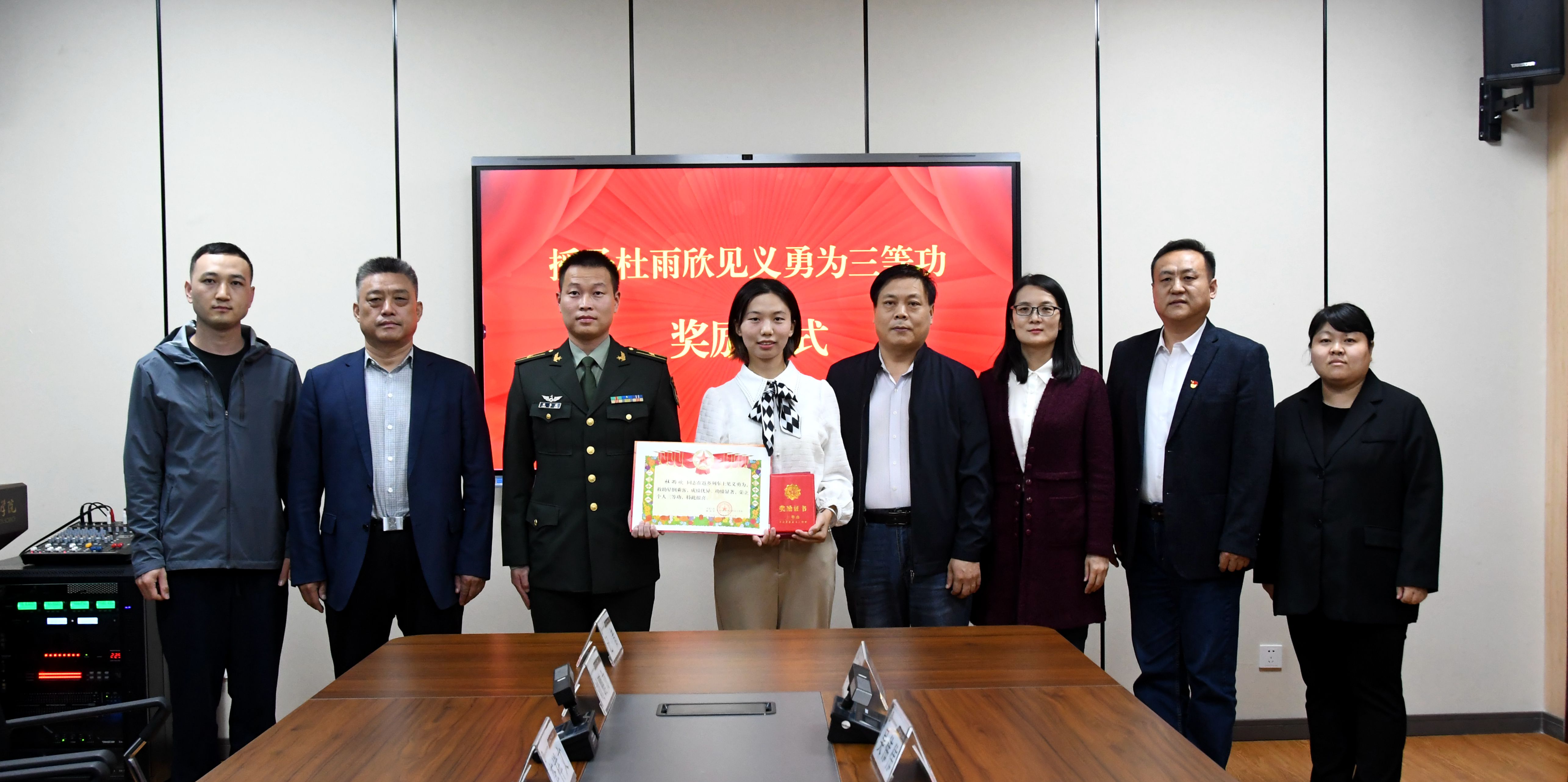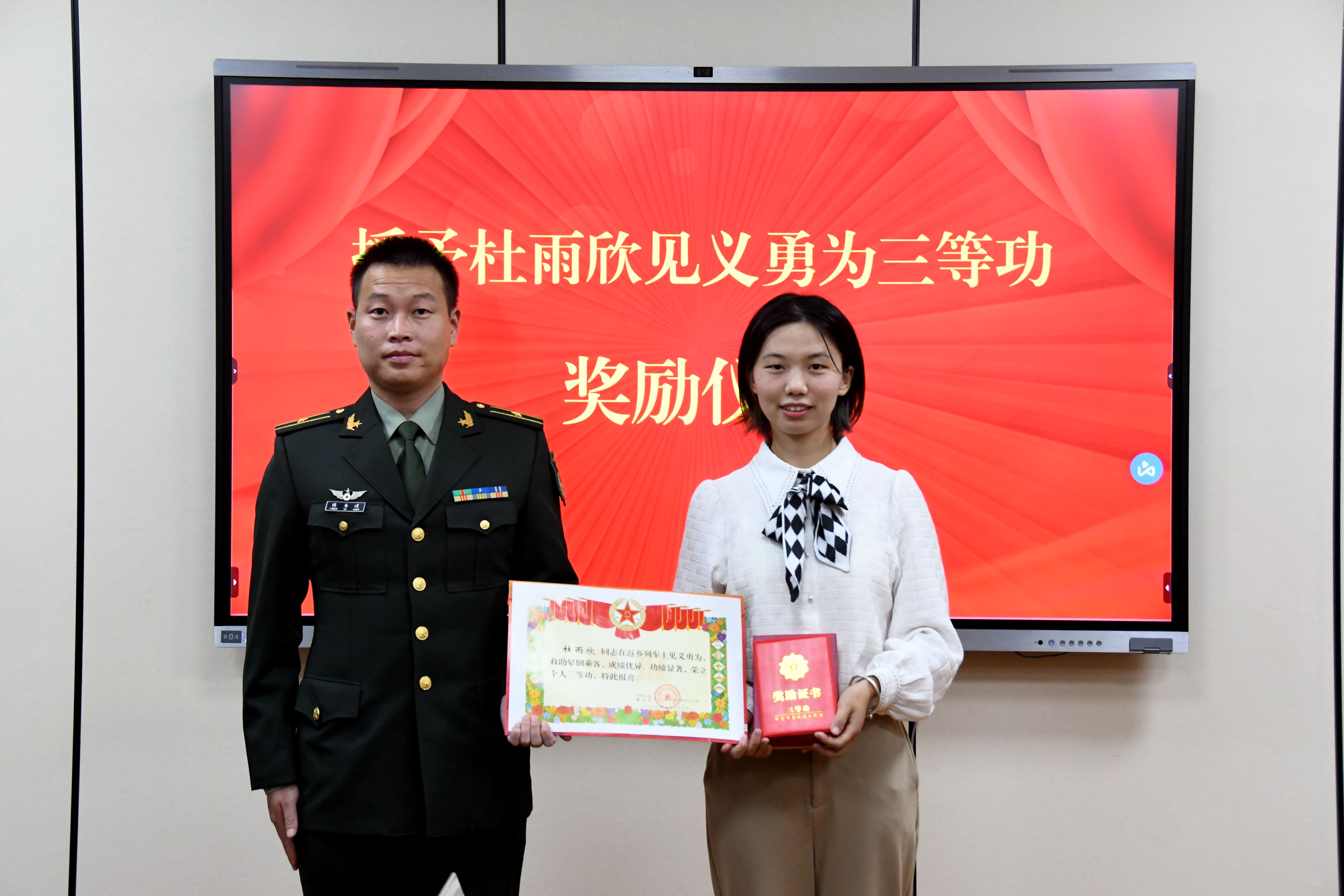 陈力逍代表杜雨欣所在部队为其颁发奖励。他表示,杜雨欣同学在部队服役期间表现优异,此次见义勇为事迹更是充分发扬了部队的优良传统,对退役及现役军人有着深刻的教育意义,希望杜雨欣作为一名退役军人和在校大学生,能够更好地发挥自身作用,退伍不褪色,积极为校争光。