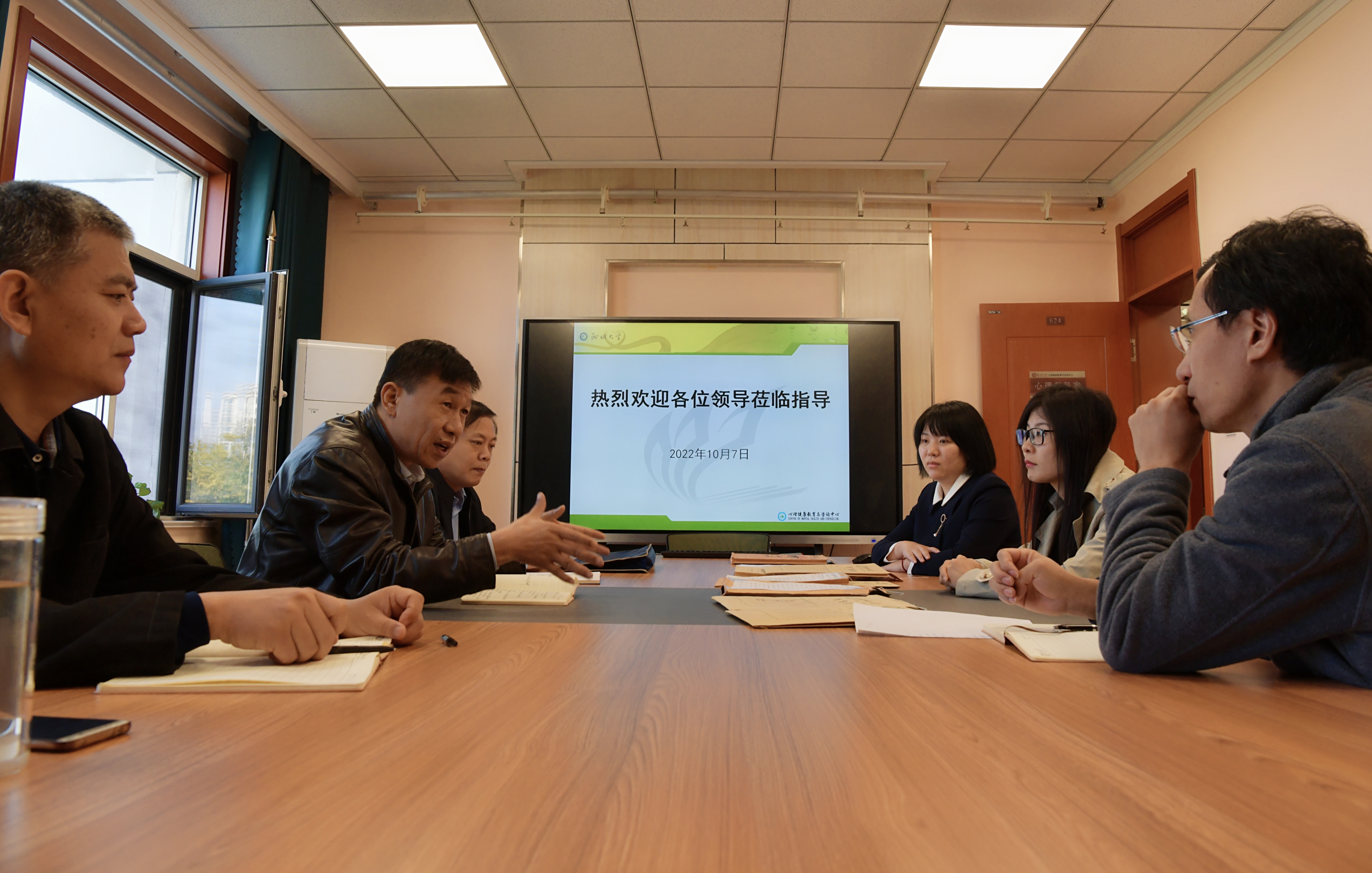 赵明吉一边听取汇报,一边现场翻阅了各学院反馈的《新生心理普测筛查约谈结果汇总表》《心理危机排查汇总表》以及心理中心《朋辈阳光心理大讲堂实施方案》《朋辈团体心理辅导活动记录表》等材料,对心理中心的工作给予了充分肯定。他指出,当前心理中心的工作需要加强专兼职师资力量建设,还要充分发挥朋辈心理辅导的作用,建设完善的朋辈辅导体系,切实了解学生心理发展动态。学生心理安全的四级网络构建已经成形,心理危机预警“面”的工作日趋完善,但是对于特殊群体学生“点”的个体的、私人定制式的关注仍有待加强。赵明吉建议以朋辈群体为抓手,提升对心理问题的识别能力,及时发现问题,实现心理安全工作“点”与“面”两个维度的结合。