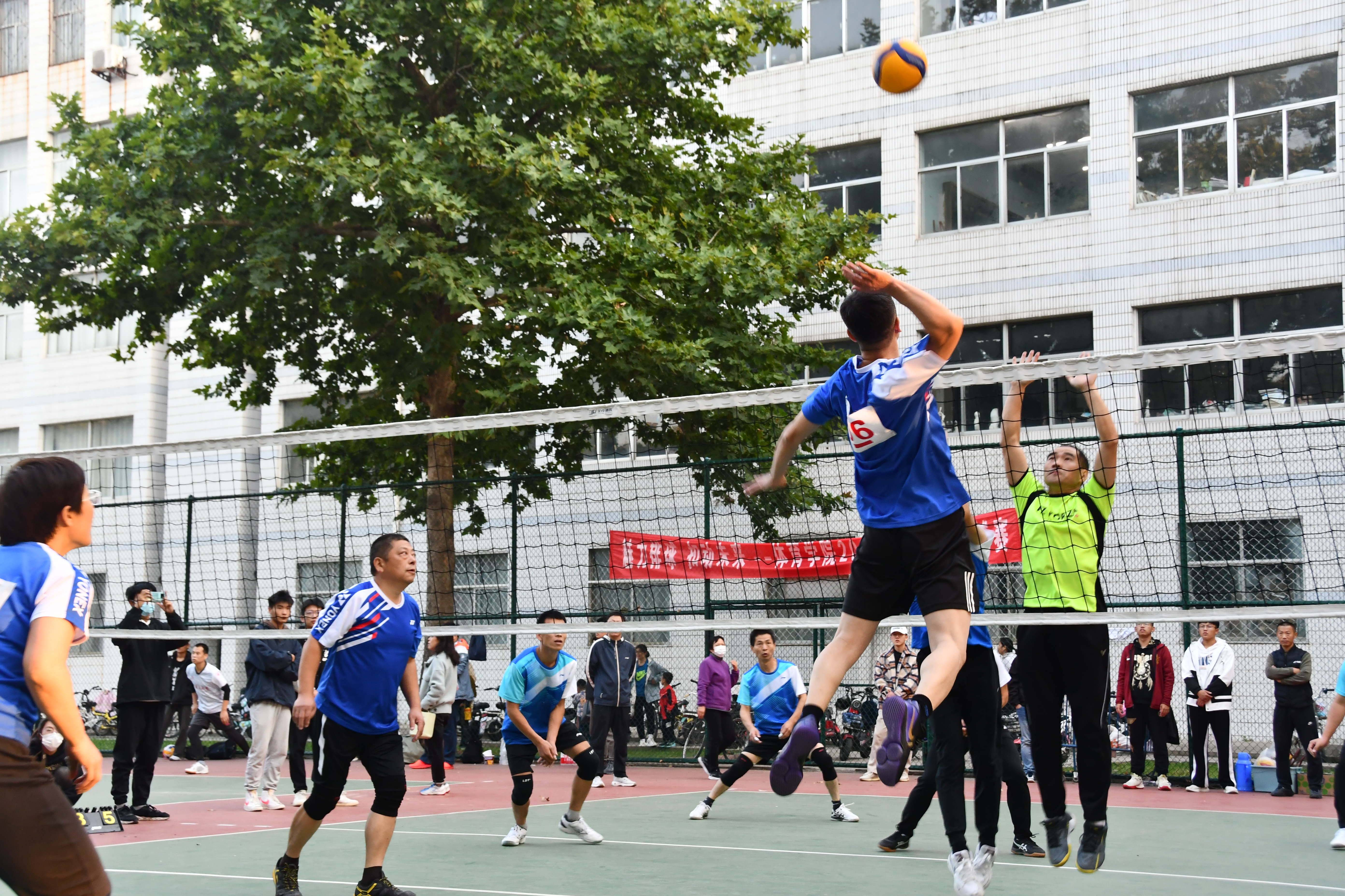 本次排球赛共有24支男教职工队与24支女教职工队参加,采用混合赛制。各参赛队对比赛高度重视,赛前进行了刻苦训练。队员们团结协作、顽强拼搏,赛事高潮迭起、精彩纷呈。比赛现场吸引了众多师生"观战",不时响起呐喊助威声与阵阵热烈的掌声。
