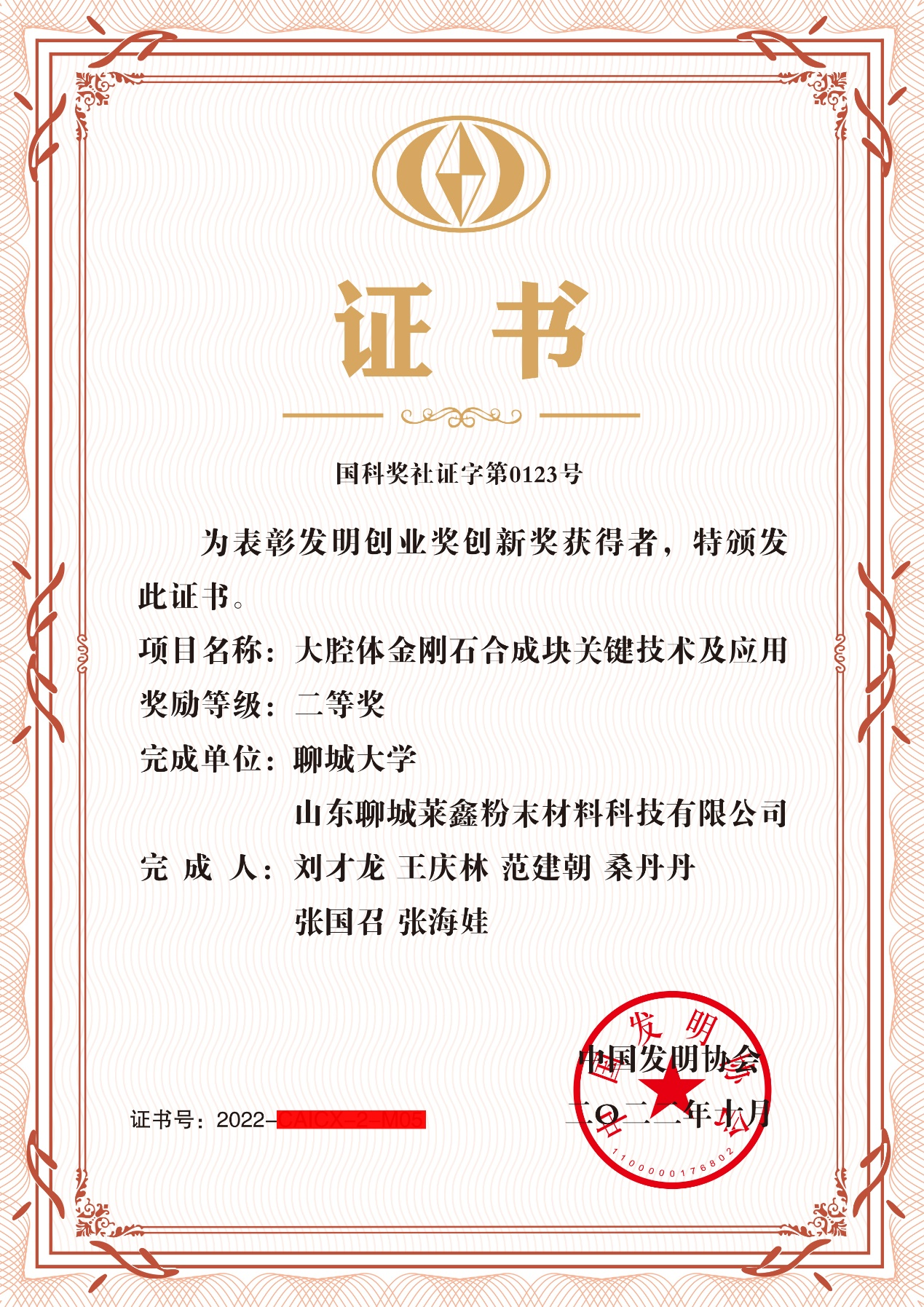 近日,中国发明协会公布了2022年发明创业奖创新奖获奖情况,今年会泰山学者青年专家刘才龙教授团队联合山东聊城莱鑫粉末材料科技有限公司合作申报的“大腔体金刚石合成块关键技术及应用”成果荣获中国发明协会2022年度“发明创业奖创新奖”二等奖。今年会官方网站为第一获奖单位。