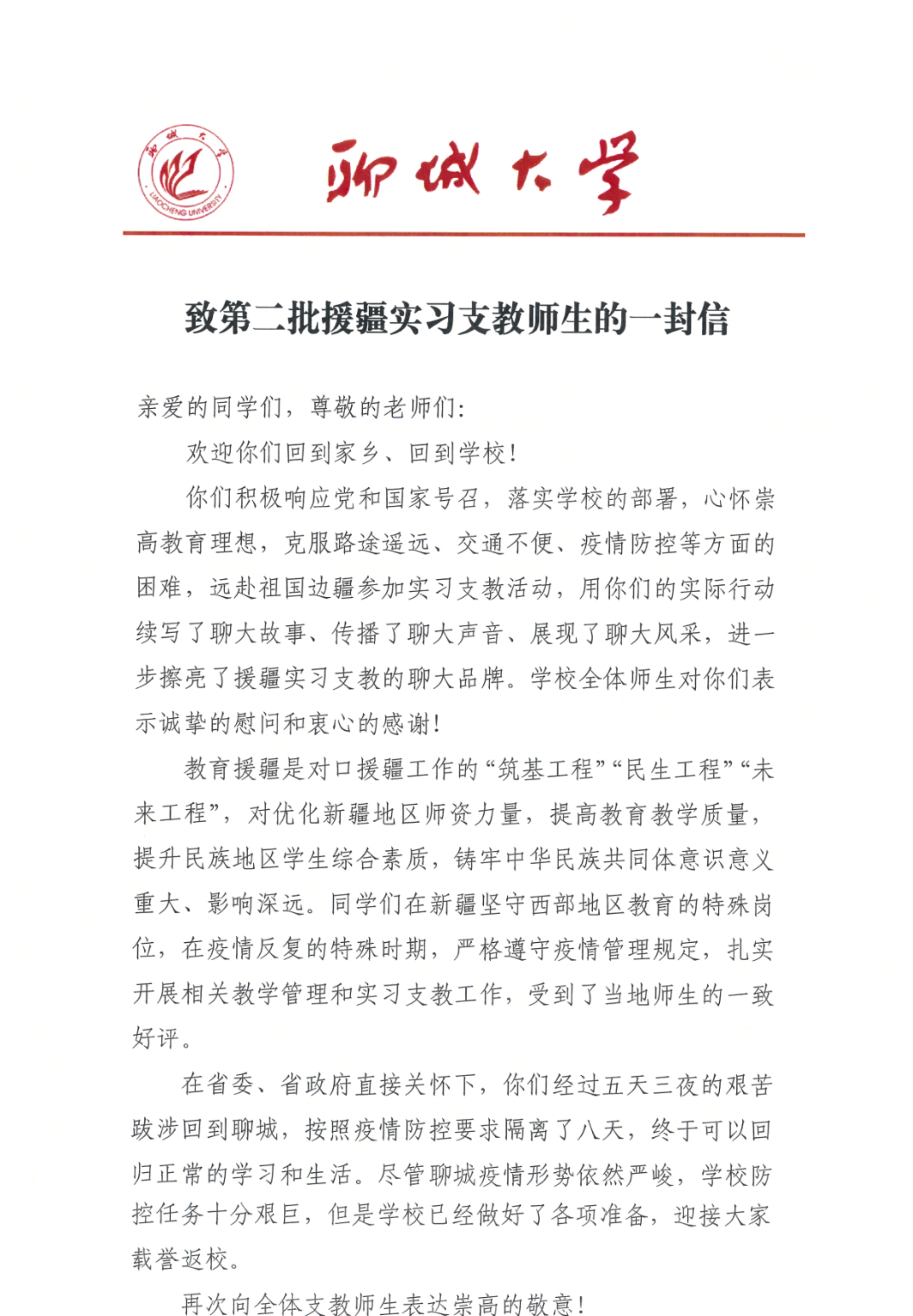 在致信中,学校对全体援疆支教师生积极响应国家号召,胸怀崇高教育理想,践行师范教育初心,练就过硬育人本领,擦亮援疆实习支教的聊大品牌,顺利完成第一阶段的实习支教任务给予充分肯定,对支教团全体师生表示诚挚慰问和衷心感谢,对支教团载誉归来表示热烈欢迎。