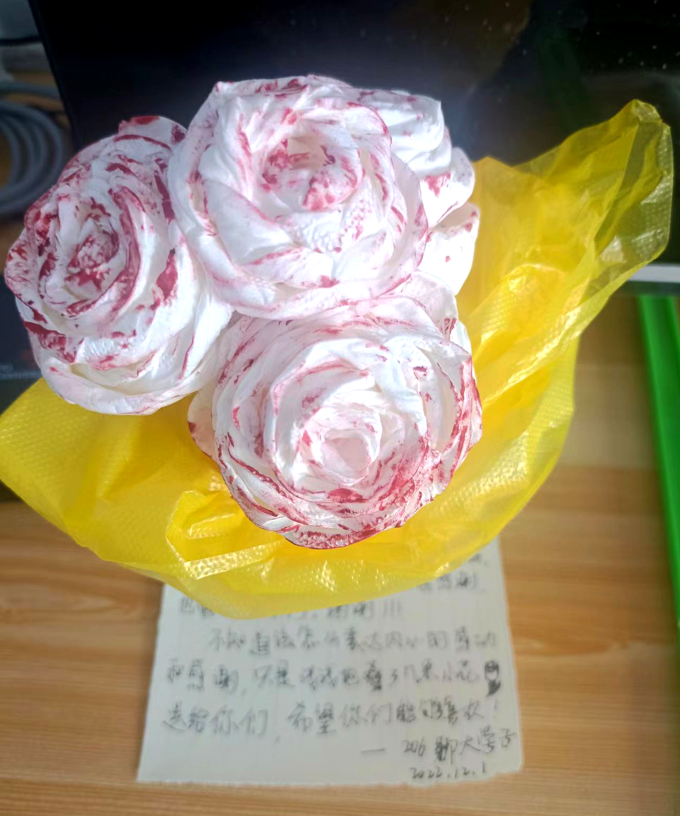 同时,同学们从枯燥的隔离生活里也体会到了温暖,学会了感恩。“每天早晨4点多钟,隔离点的服务人员都站在寒冷的室外为我们做核酸,一日三餐都准备的很及时很丰富,有什么需要很快就能满足我们,还提醒我们多穿点衣服,很温暖。”体育学院学生郭朝谦说。结束隔离时,泰安东平隔离点的同学们在房间里留下了一封封亲笔感谢信,还做了好看的手工送给当地服务人员。