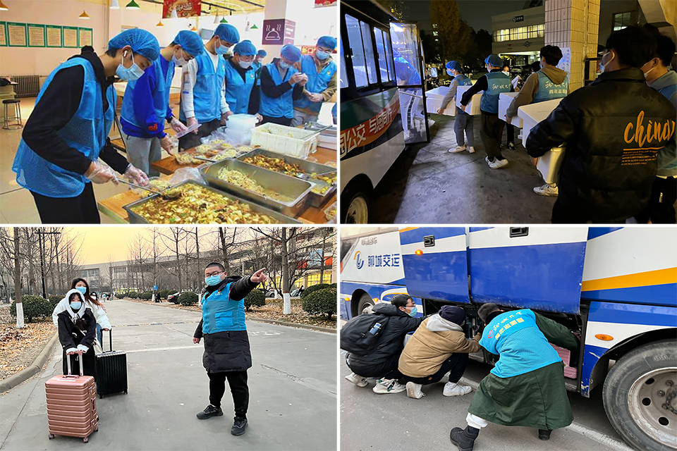在学生离校返乡工作启动后,校、院两级青年志愿者协会紧急招募1260名志愿者组建离校返乡志愿服务队,在校内16个客运乘车点、校园主干道、私家车停放区开展秩序维护、乘车引导、防疫物资发放、行李搬运、登记出校等服务,协助19988名学生顺利乘车离校返乡。