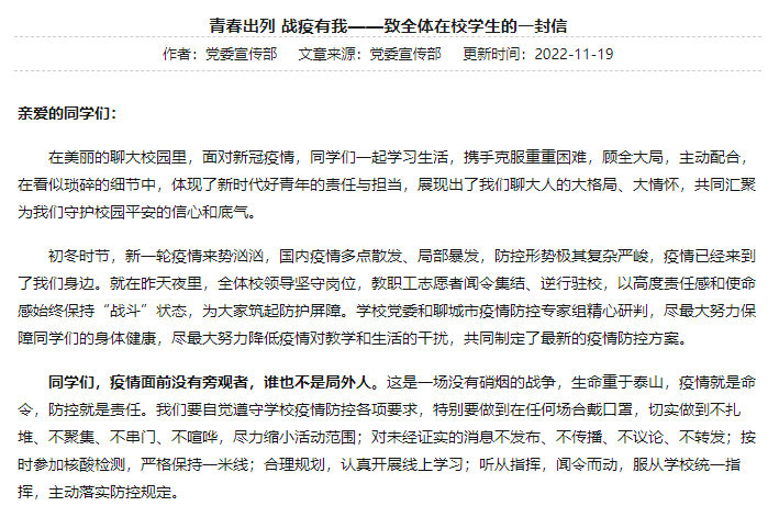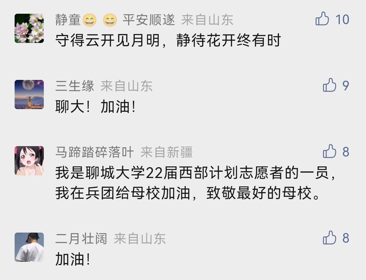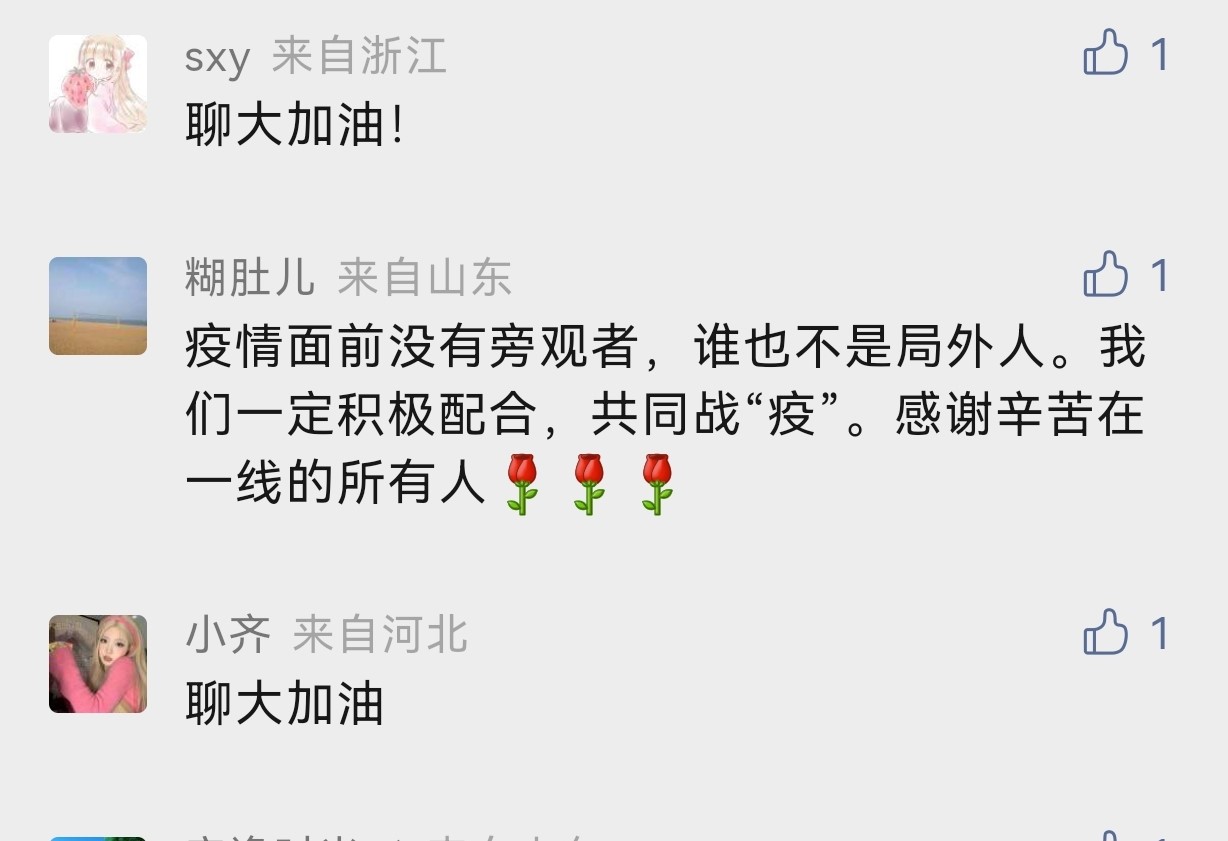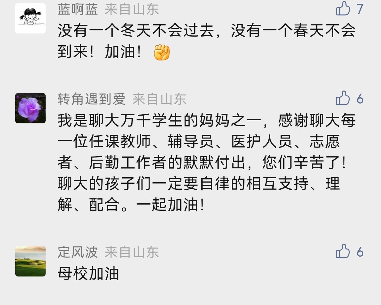 学生“小飞侠”在学校微信公众号后台留言:“聊大加油!疫情面前没有旁观者,谁也不是局外人。我们一定积极配合,共同战疫。”学生家长“转角遇到爱”说:“我是聊大学生的妈妈,感谢聊大每一位任课教师、辅导员、医护人员、志愿者、后勤工作者的默默付出,您辛苦了!”校友“马蹄踏碎落叶”也在隔空给母校祝福:“我是今年会官方网站22届西部计划志愿者的一员,母校加油!致敬最好的母校!”