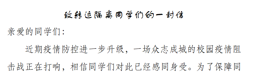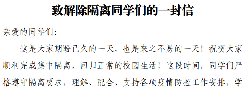 信中说,“全体校领导坚守岗位,教职工志愿者闻令集结,为大家筑起防护屏障。”“非常时期,非常行动,尽管学校尽了最大努力,但隔离点的居住生活条件肯定不如宿舍方便。”“在宿舍待久了,会很辛苦,我们感同身受,我们能理解。”“同学们配合、支持各项疫情防控工作安排,也是这场抗疫战斗中可钦可敬的英雄!”“疫情防控仍处于关键时期,还需要同学们坚持坚守,为学校疫情防控作出新的贡献!”朴实的话语,透着理解、温暖、赞赏和期待,极大地鼓舞了同学们的信心与斗志,赢得了大家的强烈共鸣与积极响应。