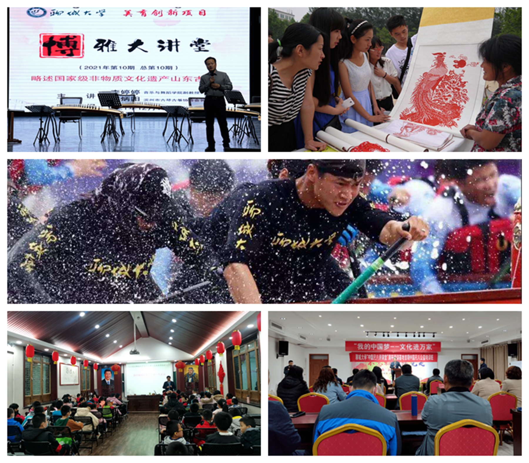 相关二级单位长期实施推进非物质文化遗产、民间艺术、国学、龙舟、运河文化等优秀传统文化知识的传授、技能的培养、项目的传承创新,对内润泽培养学生,对外积极满足群众的精神文化需求。仅美术与设计学院方面,便四次获批山东省非物质文化遗产传承人群研修培训计划,承办了“木版年画”“葫芦雕刻”“剪纸艺术”“泥塑面塑”非物质文化遗产传承人群培训;2020年东昌府木版年画传承获批“山东省中华优秀传统文化传承基地”。