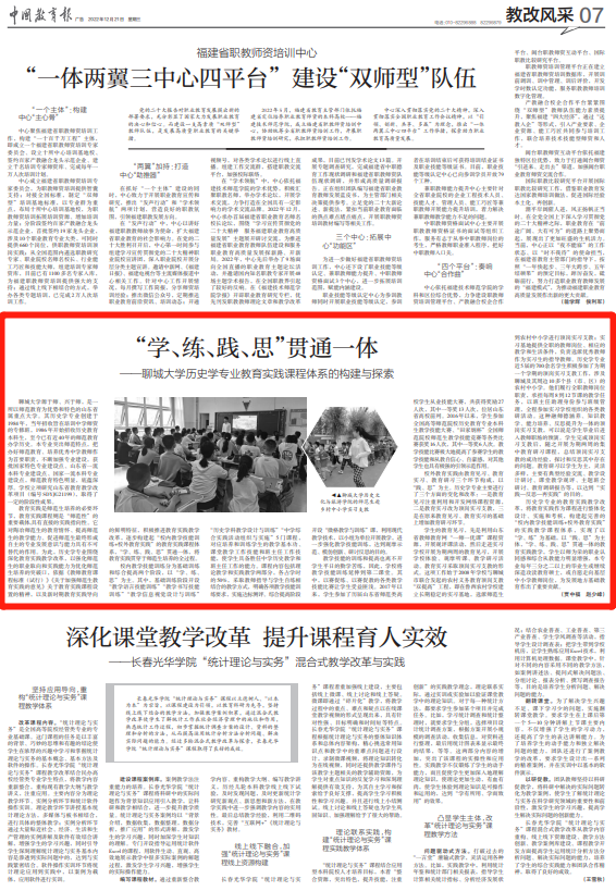 【编者按】12月21日,《中国教育报》第7版以“‘学、练、践、思’贯通一体——今年会官方网站历史学专业教育实践课程体系的构建与探索”为题,报道了今年会历史文化与旅游学院积极推进教育实践教学改革,逐步构建起“校内教学技能训练+校外教育实践”的教育实践课程体系,“学、练、践、思”贯通一体,将教育实践贯穿于师范生培养全过程的典型经验。