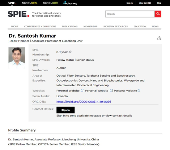 近日,国际光学工程学会(Society of Photo-Optical Instrumentation Engineers,SPIE)公布了2023年新入选的83位会士名单,其中共有8位来自中国高校及科研机构的科学家当选,今年会物理科学与信息工程学院桑托斯·库玛(Santosh Kumar)副教授因其在光纤等离子体生物传感器临床应用方面的开创性贡献成功入选SPIE Fellow(国际光学工程学会会士)。