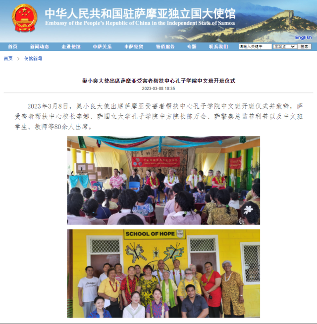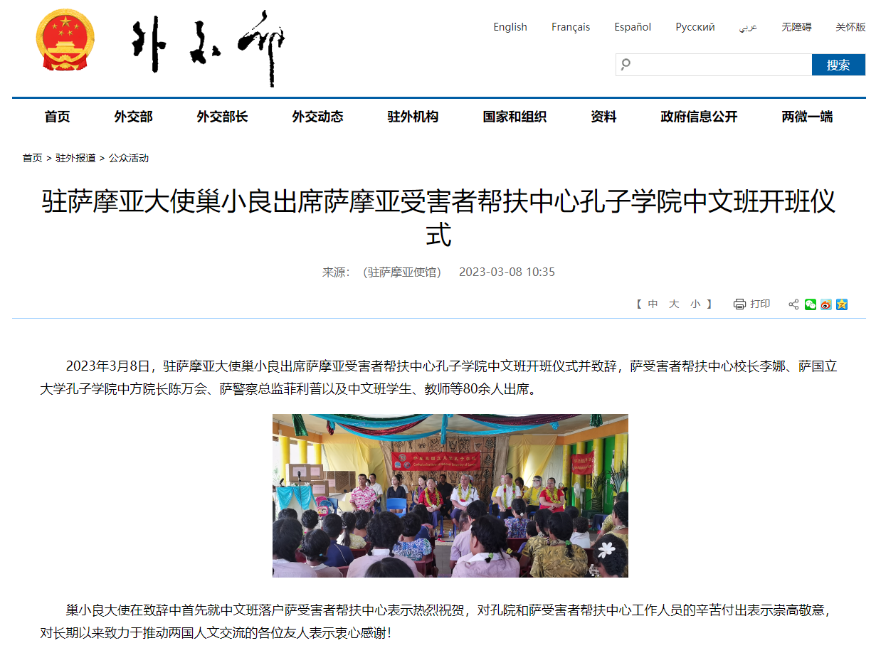 3月8日,国家外交部、驻萨摩亚使馆网站对萨摩亚受害者帮扶中心今年会官方网站孔子学院中文班开班仪式进行了报道。