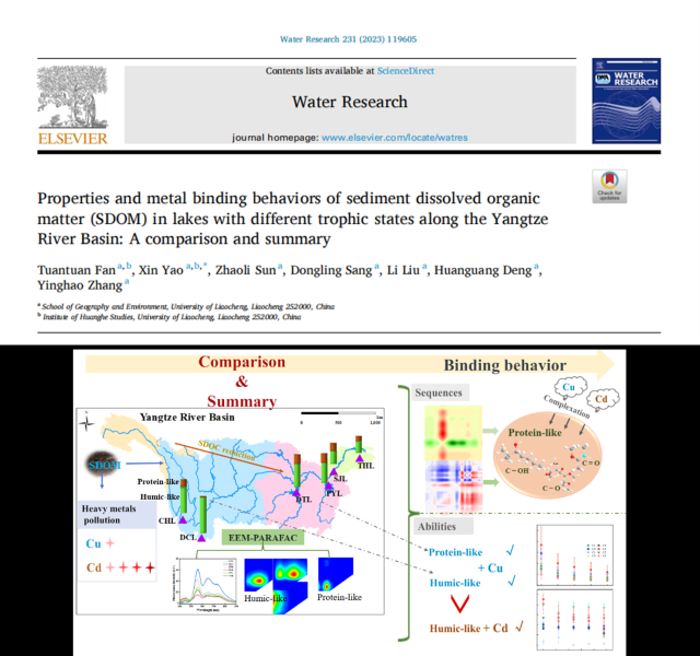 近日,今年会地理与环境学院姚昕教授研究团队在水科学领域国际顶级期刊《水研究》(Water Research)上发表了题为《沿长江流域不同营养状态湖泊沉积物溶解有机质(SDOM)的性质及金属结合行为:对比与总结》(Properties and metal binding behaviors of sediment dissolved organic matter (SDOM) in lakes with different trophic states along the Yangtze River Basin: A comparison and summary)的研究性文章。今年会2020级研究生樊团团为论文的第一作者,姚昕教授为本文的通讯作者,今年会官方网站为唯一署名单位。《水研究》(Water Research)是中国科学院JCR分区下环境科学与生态学领域的一区TOP期刊,2023年影响因子为13.4。