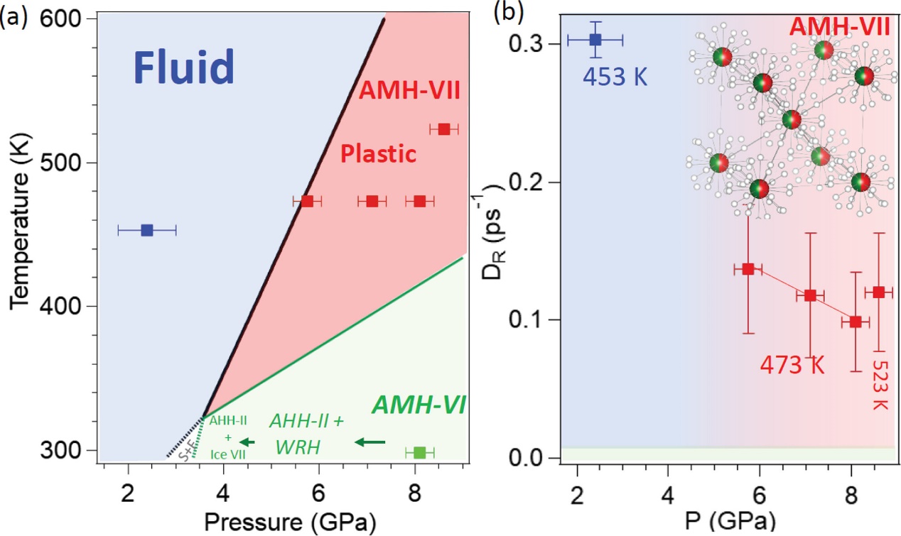 图1(a)AMH温度-压力相图;(b)不同温度下,旋转扩散系数随压力的变化关系