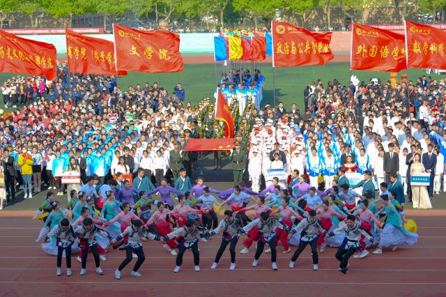 各学院代表方队充满青春活力、富有学院特色的入场式表演,赢得了在场观众的阵阵掌声。音乐与舞蹈学院以及民族班预科生代表方队分别带来了婀娜多姿的民族舞蹈,外国语学院代表方队高举用汉语、英语、日语等五种语言写成的“你好,聊大”字牌,机械与汽车工程学院代表方队带来的变形金刚吉祥物形象灵动……体育学院代表方队划着龙舟,伴着激越的鼓声而至,每一个雄壮有力的动作都体现了“团结协作、顽强拼搏、不怕困难、激流勇进”的聊大龙舟精神。