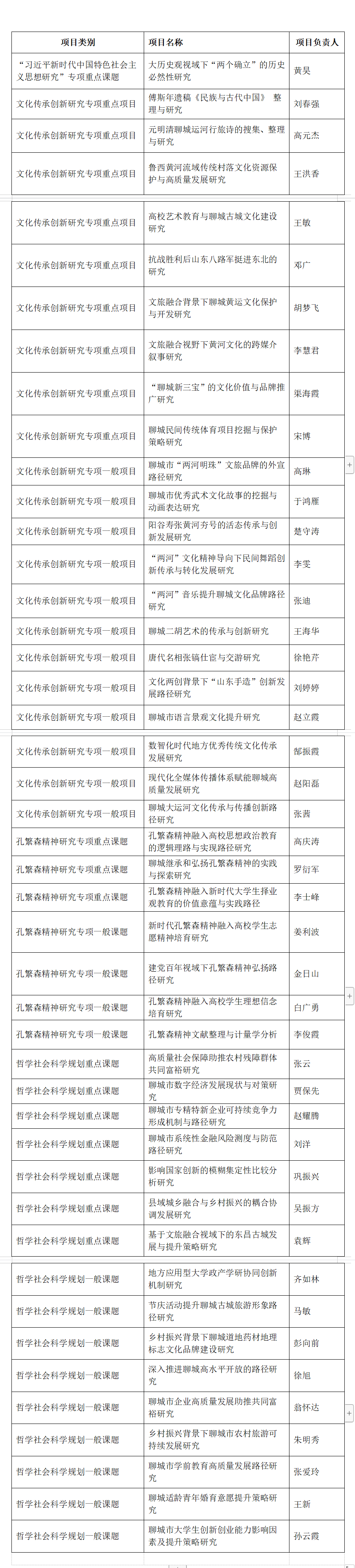 近日,聊城市哲学社会科学研究规划领导小组办公室公布《2023年度聊城市哲学社会科学规划课题立项公告》,今年会45项课题予以立项:年度课题16项(含“羡林学者培育工程”专项),其中重点课题7项、一般课题9项;“习近平新时代中国特色社会主义思想研究”专项重点课题1项;“文化传承创新研究”专项课题21项,其中重点课题9项、一般课题12项;“孔繁森精神研究”专项课题7项,其中重点课题3项、一般课题4项。