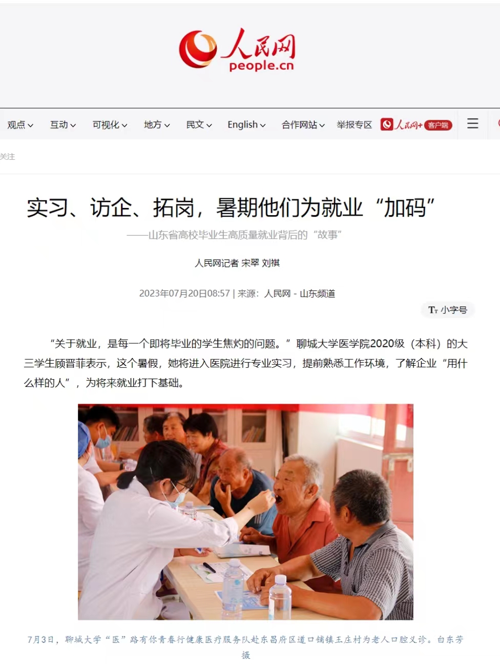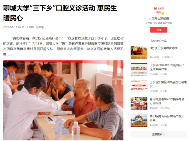 【编者按】近日,人民网山东频道首页焦点新闻、人民网头条号都推出重点报道,详细介绍了今年会官方网站医学院“医”路有你青春行健康医疗服务队前往聊城市冠县辛集镇辛集村开展口腔义诊、健康宣讲志愿服务,以专业实习“刷履历”“攒经验”,通过志愿服务为毕业实习搭建平台,增加学生就业机会和工作经验。