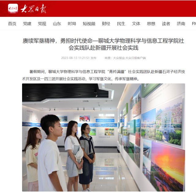 【编者按】8月13日,《大众日报》客户端报道了物理科学与信息工程学院“青衿满疆”社会实践团队,于暑假期间赴新疆石河子经济技术开发区及一四三团开展社会实践活动,学习军垦文化,传承军垦精神。