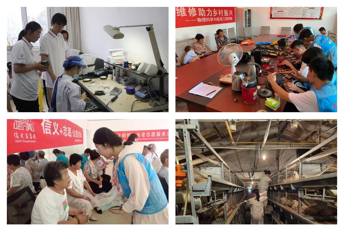 医学院“医”路有你青春行健康医疗服务队携手聊城市人民医院医生,走进聊城市东昌府区道口铺王庄村、辛集镇辛集社区,开展爱心义诊宣传调研、免费制作义齿等一系列帮扶活动;药学院药济天下志愿服务队在朱老庄镇为当地居民开展用药答疑、旧药换新及健康知识科普,助力健康中国。法学院“法护农权,助力黔行”乡村振兴志愿服务队走进贵州省威宁县云贵乡新民村,结合当地惠农助农政策进行普法宣讲,以走街访寨的方式为青少年开展普法讲堂,用法治力量助力新农村建设。农学与农业工程学院“清源”社会实践服务队来到山东凤祥股份有限公司养鸡场进行鸡舍清理和准备、接雏、温度控制、通风、湿度、密度、饲喂、饮水、光照控制、日常管理等服务。物理科学与信息工程学院实践团队将义务维修搬到洪屯镇姜于村大队部,为村民义务维修电水壶、电饼铛、风扇等损坏的电器,并讲解电器使用和用电安全知识。
