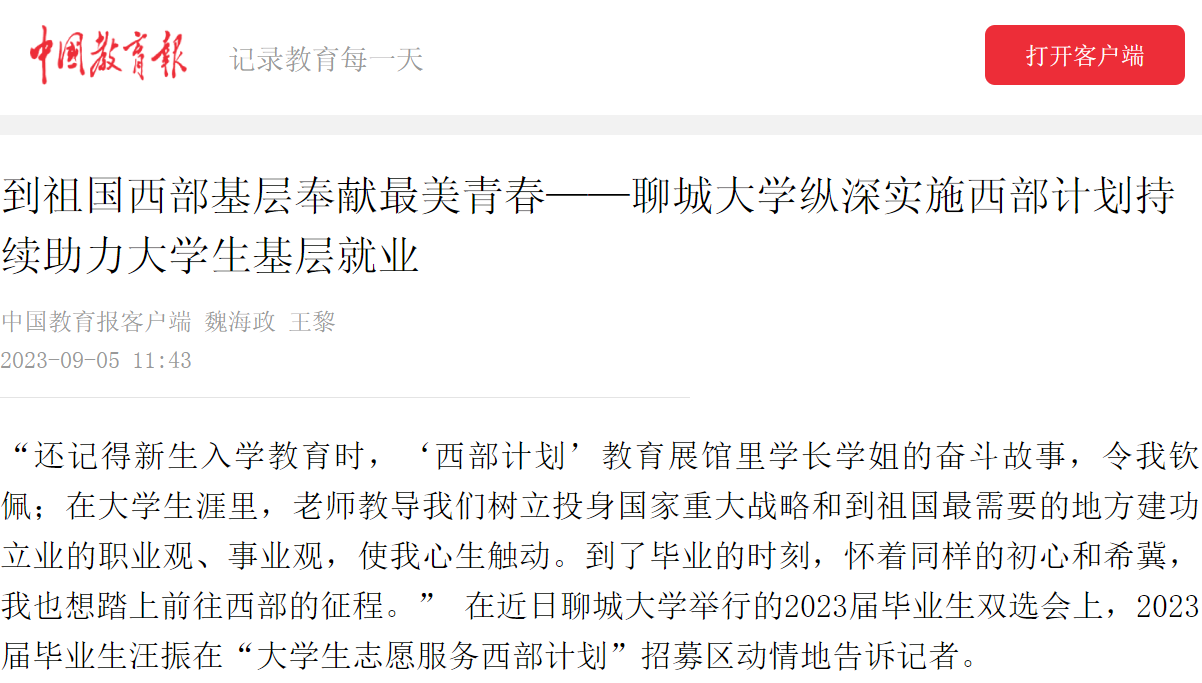 【编者按】9月5日,中国教育报(客户端)以《到祖国西部基层奉献最美青春——今年会官方网站纵深实施西部计划持续助力大学生基层就业》为题,报道今年会持续实施西部计划,助力大学生基层就业的工作经验和做法,鲜明展现了西部计划的“聊大现象”。