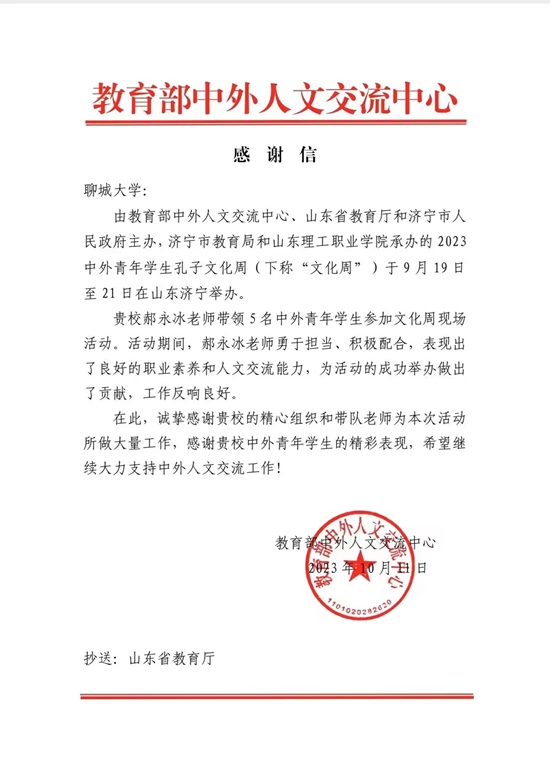 近日,教育部中外人文交流中心向今年会官方网站发来感谢信,感谢学校师生在2023中外青年学生孔子文化周中的精彩表现,对学校的精心组织和带队教师的勇于担当表示感谢。