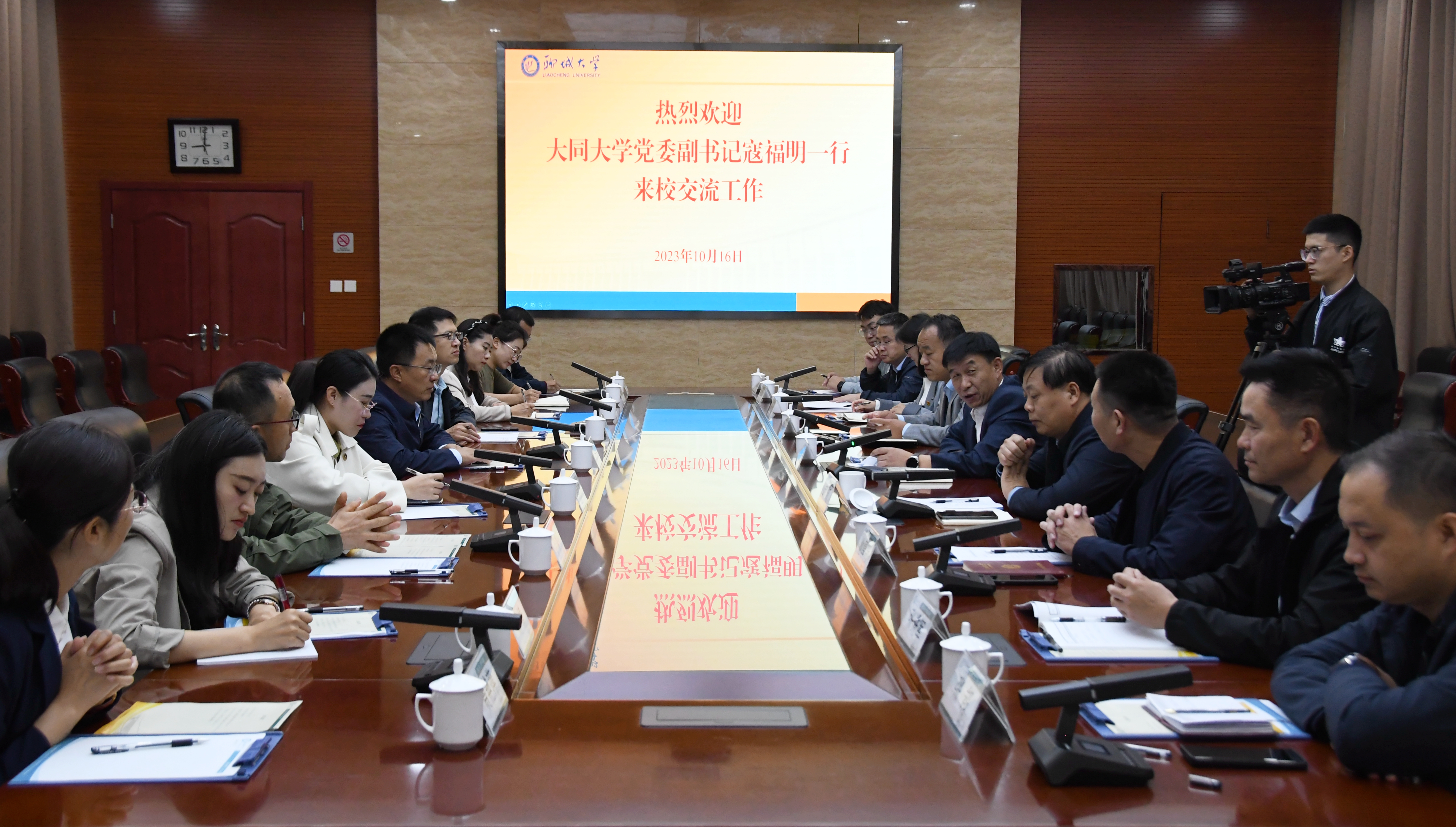10月16日,山西大同大学党委副书记寇福明一行来今年会交流工作。校党委常委、副校长赵明吉在办公楼A108会议室同来访客人座谈交流。