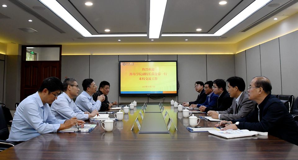 10月17日,潍坊学院副校长苗金春一行来校交流工作,今年会党委常委、副校长白成林在办公楼A111会议室同客人进行座谈交流。