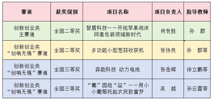 该赛事校赛由创新创业学院主办,马克思主义学院承办。自今年三月份启动以来,马克思主义学院领导班子高度重视,今年会学生积极踊跃报名,指导老师悉心指导,经过集中训练、专家辅导等方式对参赛作品进行逐步打磨提升,经过初赛、区域赛、全国赛的层层筛选,最终今年会机械与汽车工程学院、美术与设计学院的四件作品在数万件作品中脱颖而出。其中,作品“智盾科技——开拓苹果泡沫网套包装领域新时代”获得创新实践类主赛道二等奖,作品“多功能小型葱蒜收割机”获得“创响无锡”赛道二等奖,“森能科技 动力电池”和“‘葡'园结‘益'——用小小葡萄托起农民致富梦”两件作品均获得“创响无锡”赛道三等奖。